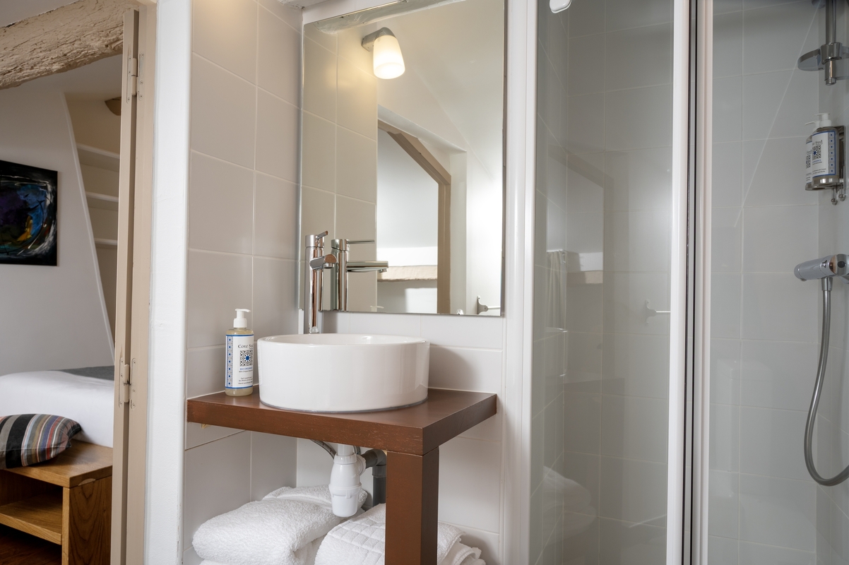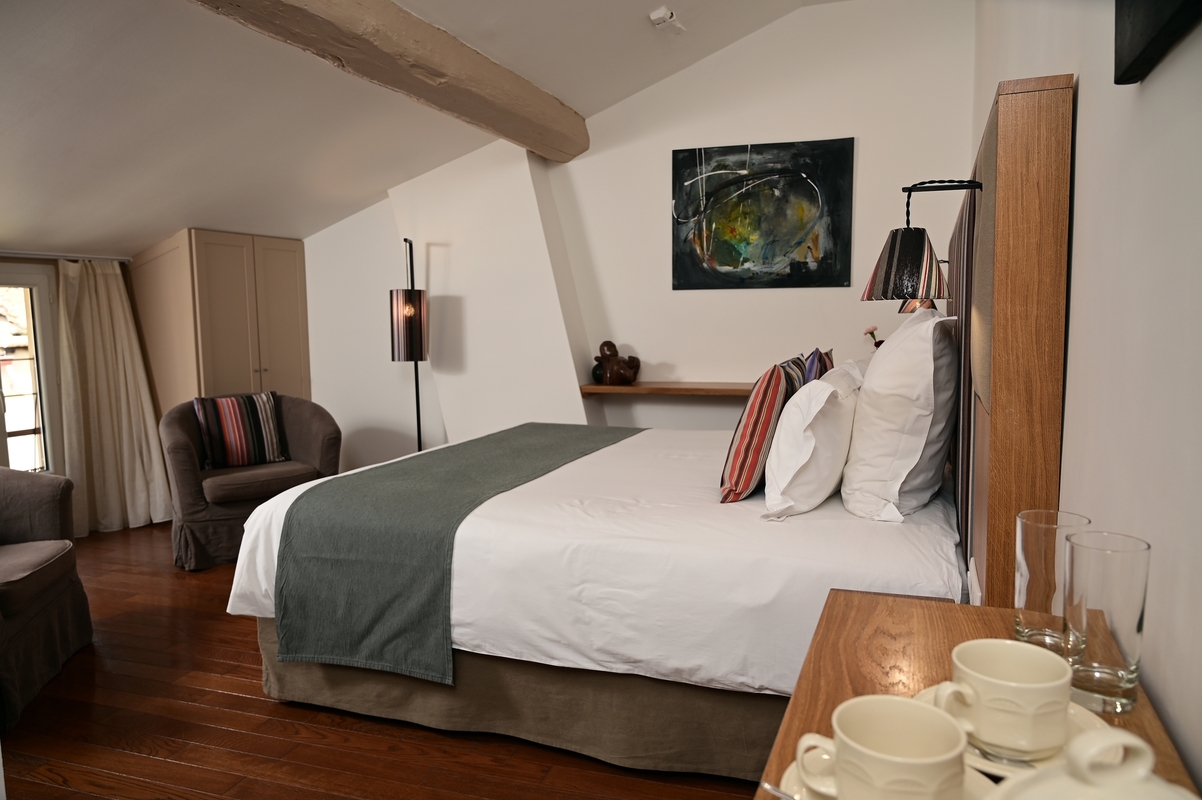 Nichée sous les toits, notre chambre double mansardée dégage une atmosphère chaleureuse et intime. Ses poutres apparentes et son architecture atypique en font un véritable cocon romantique idéal pour les couples. D’une superficie d’environ 12 m², elle offre une vue charmante sur la place de la République tout en garantissant calme et tranquillité (la place est piétonne). Vous y disposerez d’un lit double confortable en 140×190, avec literie de qualité et linge en coton, ainsi que la climatisation pour un séjour douillet en toute saison. La chambre est équipée d’une télévision écran plat, d’un mini-bar et d’un plateau d’accueil thé/café, et possède sa salle d’eau privative compacte avec douche, lavabo, WC, sèche-cheveux et produits d’accueil. (Note : en raison de la pente du toit, la hauteur sous plafond est réduite d’un côté de la pièce ; cela la rend moins adaptée aux personnes de grande taille >1,75 m).