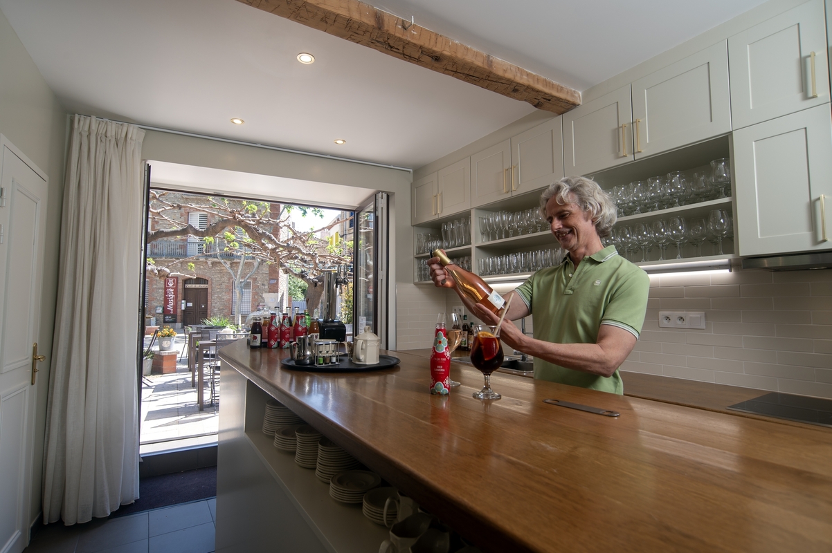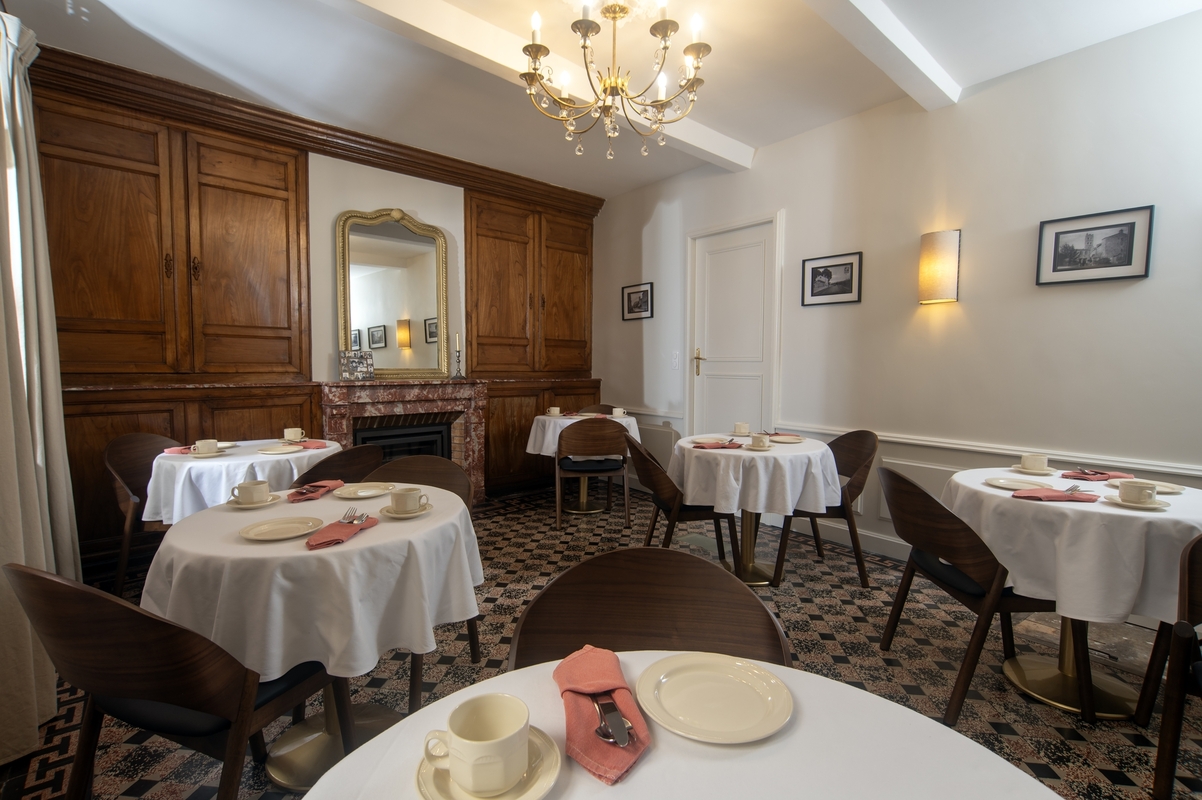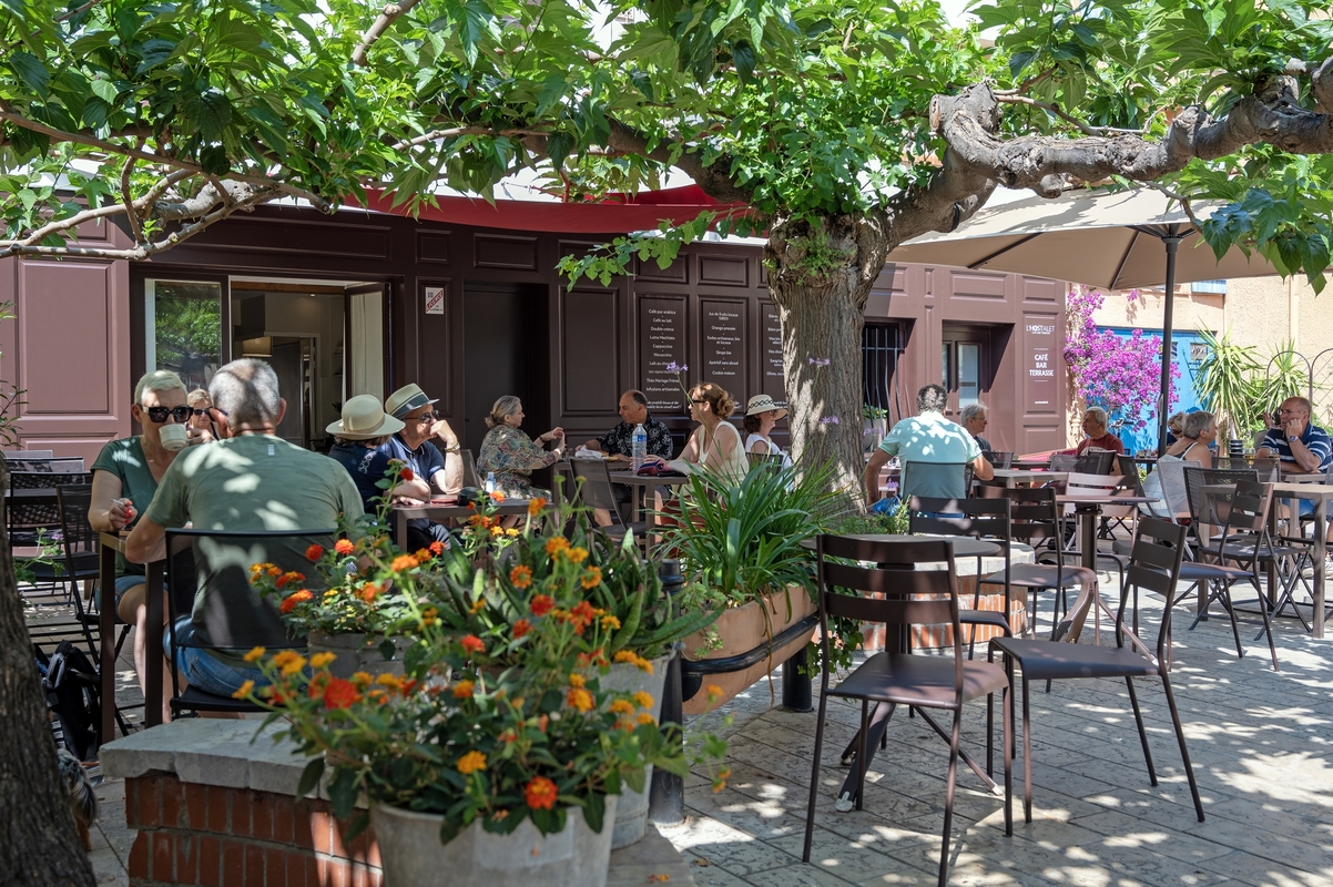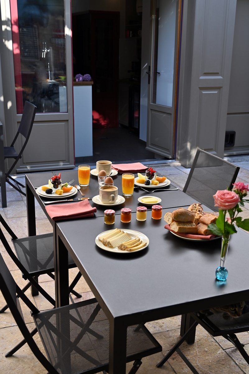 Le matin, un petit-déjeuner gourmand est servi sur la terrasse ensoleillée de la place (ou au coin du feu de la salle à manger l’hiver). Fruits frais découpés, jus d’orange pressé, pain artisanal assorti de confitures et gâteaux faits maison, fromages fermiers, œufs cuisinés à la demande, sans oublier café bio et thés de qualité – un repas matinal composé uniquement de produits locaux et de saison. Ce petit-déjeuner maison est très apprécié des visiteurs pour sa fraîcheur et sa générosité. Par ailleurs, d'avril à octobre, la terrasse fait office de café-bar où déguster boissons artisanales régionales, vins du cru, sangria maison et autres rafraîchissements sous les mûriers plus que centenaires.