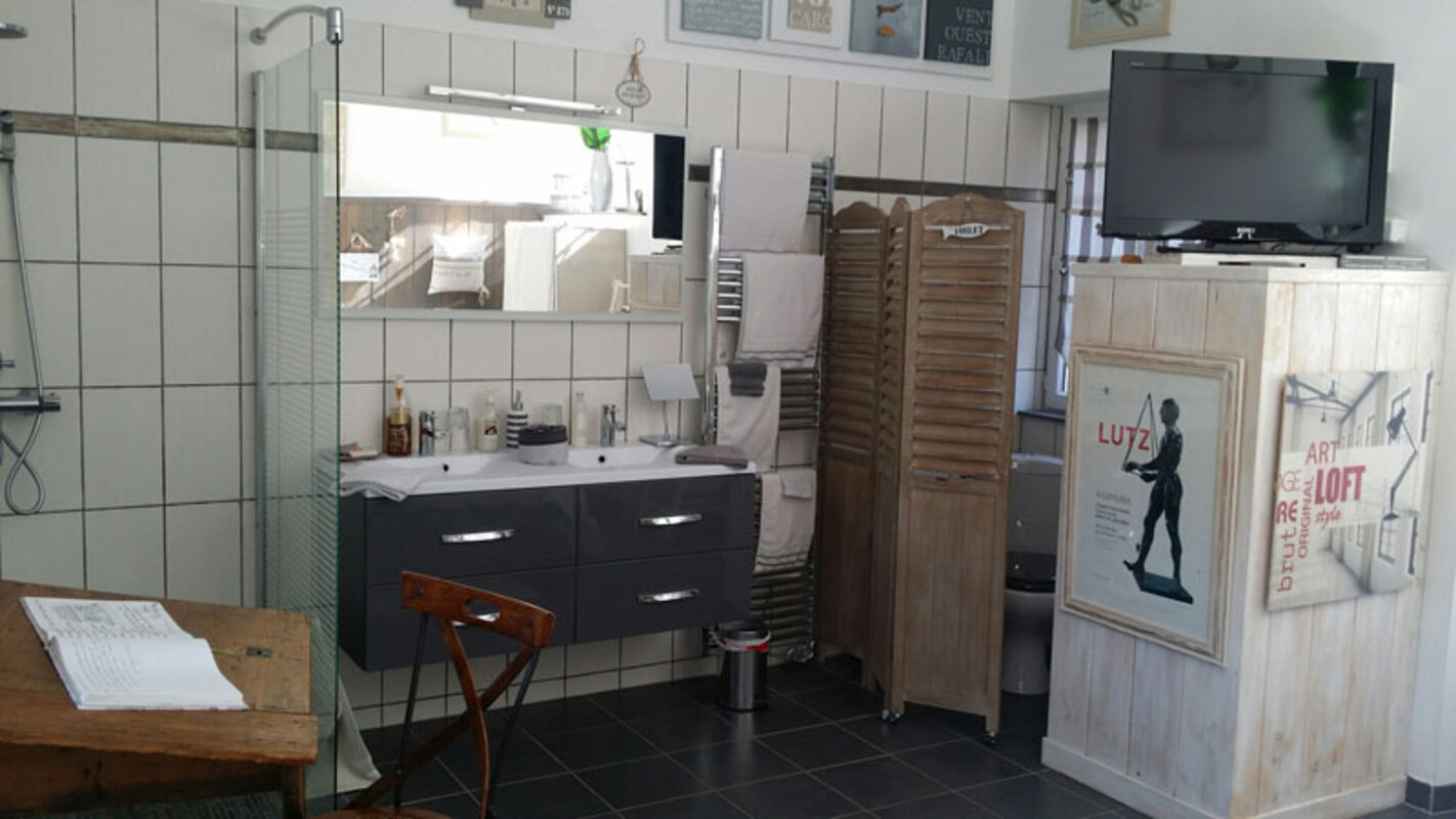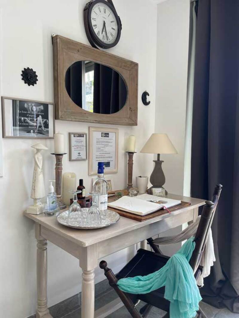 Chambre Clémence de 35m² le bas avec coin bureau et douche à l'italienne donne une agréable vue sur la terrasse ainsi que la piscine et possède une capacité d’accueil aussi pour 4 personnes avec sa suite à l'étage.