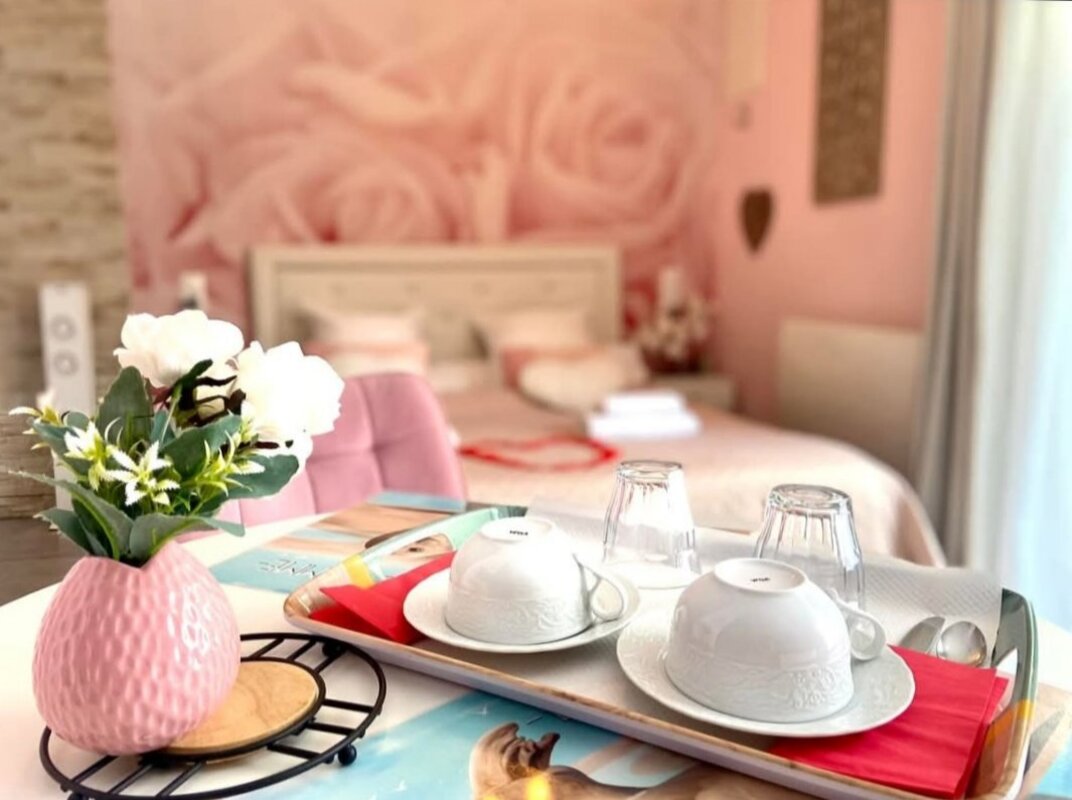 Petit déjeuner en chambre avec gâteau battu, petite brioche, yaourts, compotes, confiture, nutella, jus d'orange, lait, chocolat, café, thé.