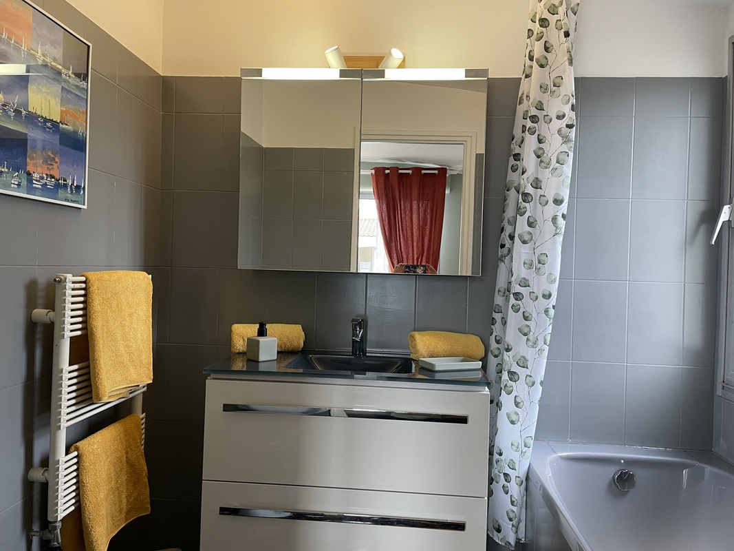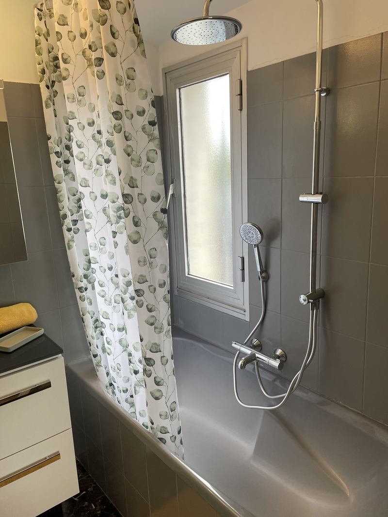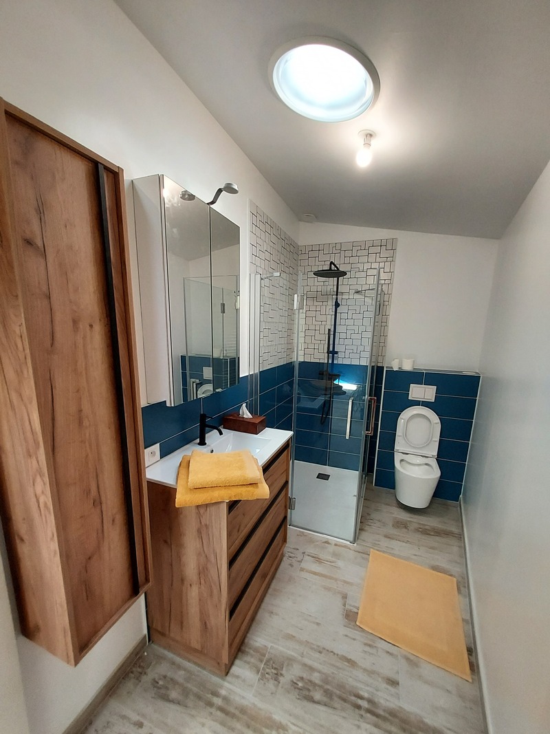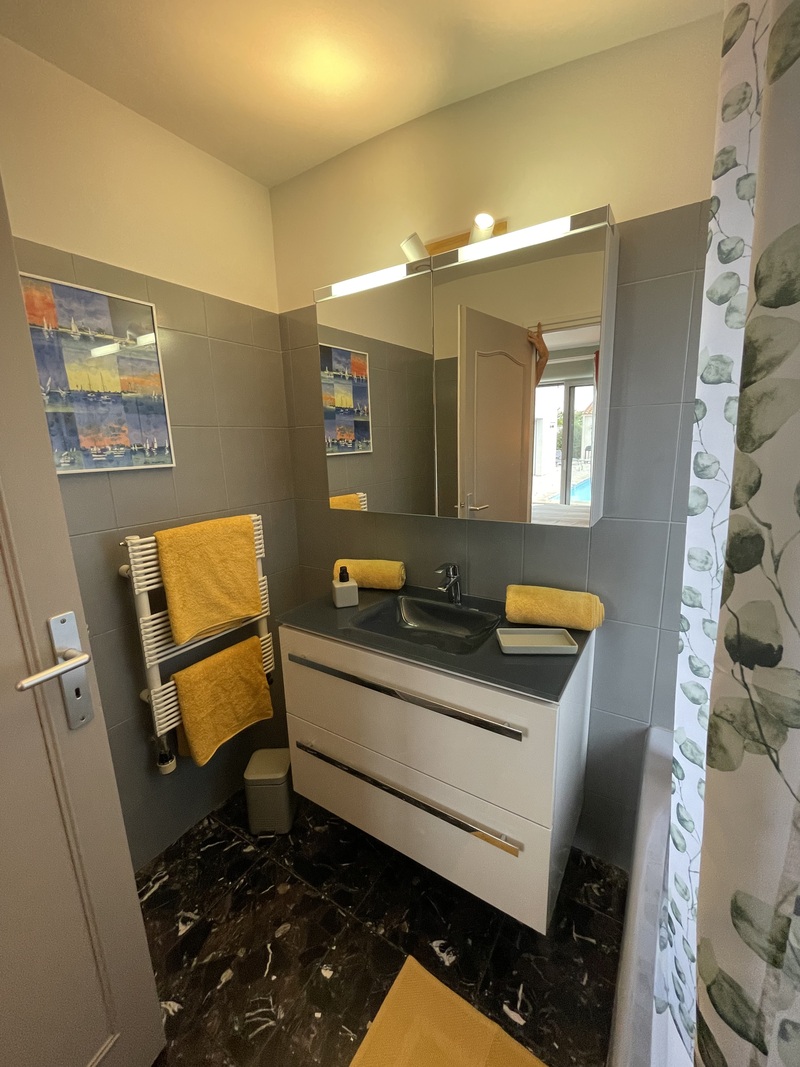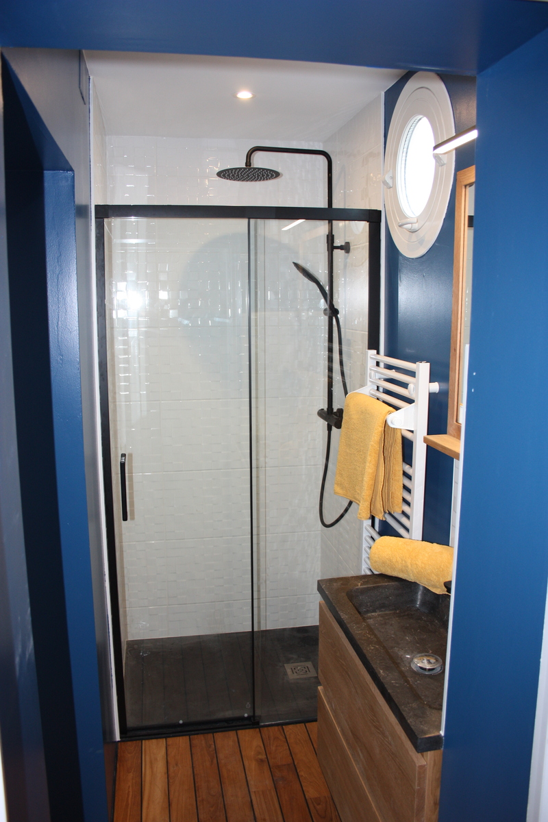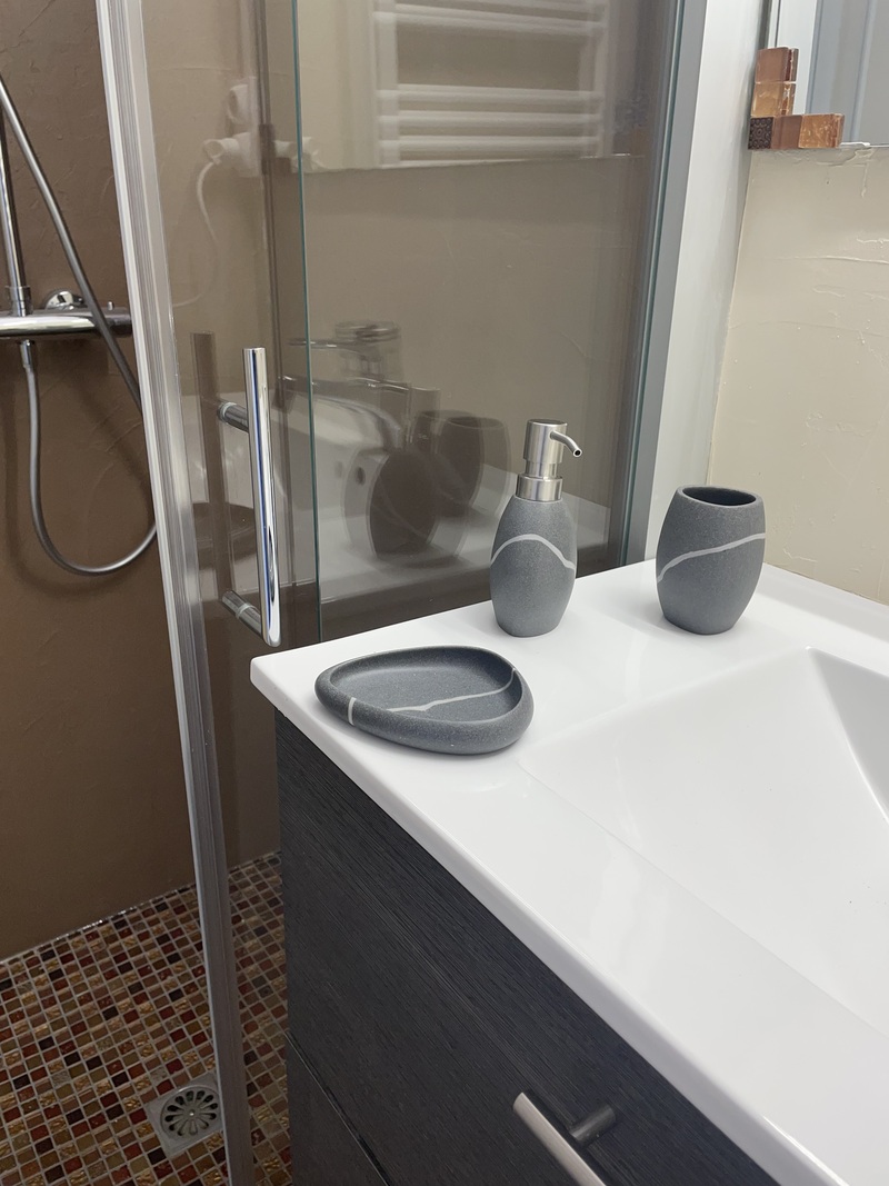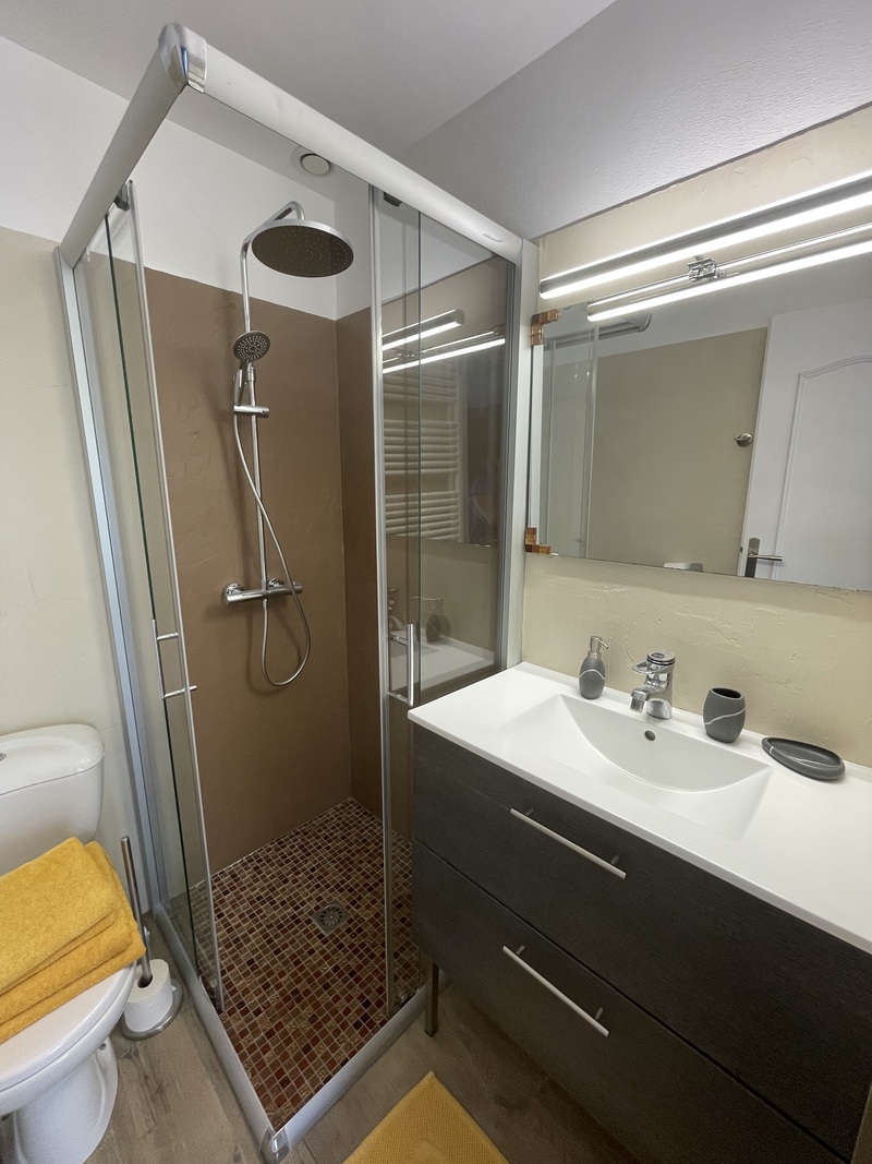 La salle d'eau est composée d'une douche d'un meuble lavabo