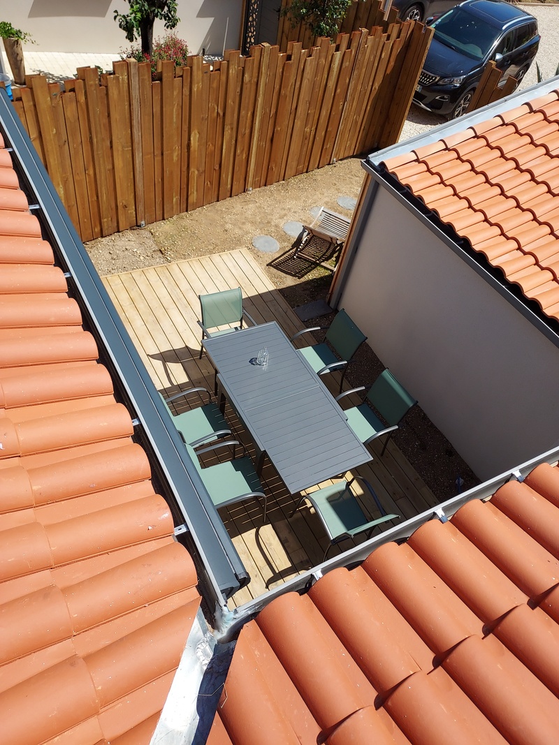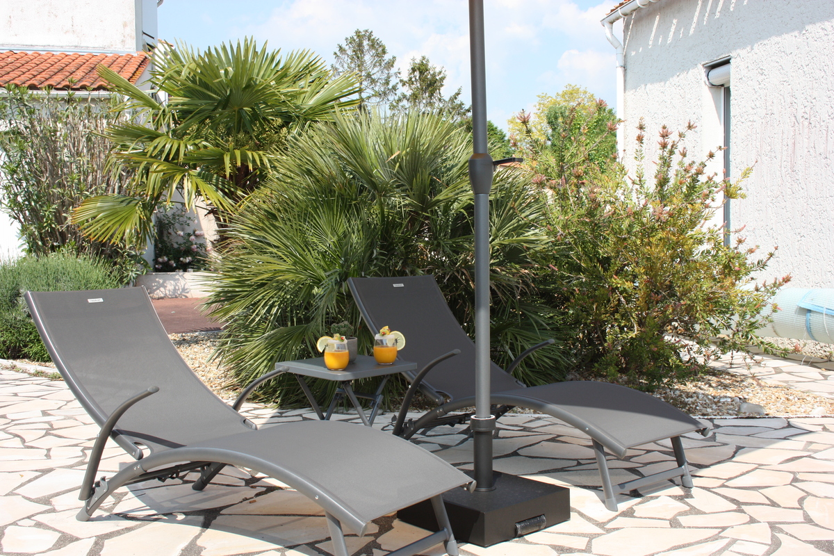 Terrasse, mobilier de jardin, cour, transats, jardin, terrain clos, borne de recharges pour voitures électriques