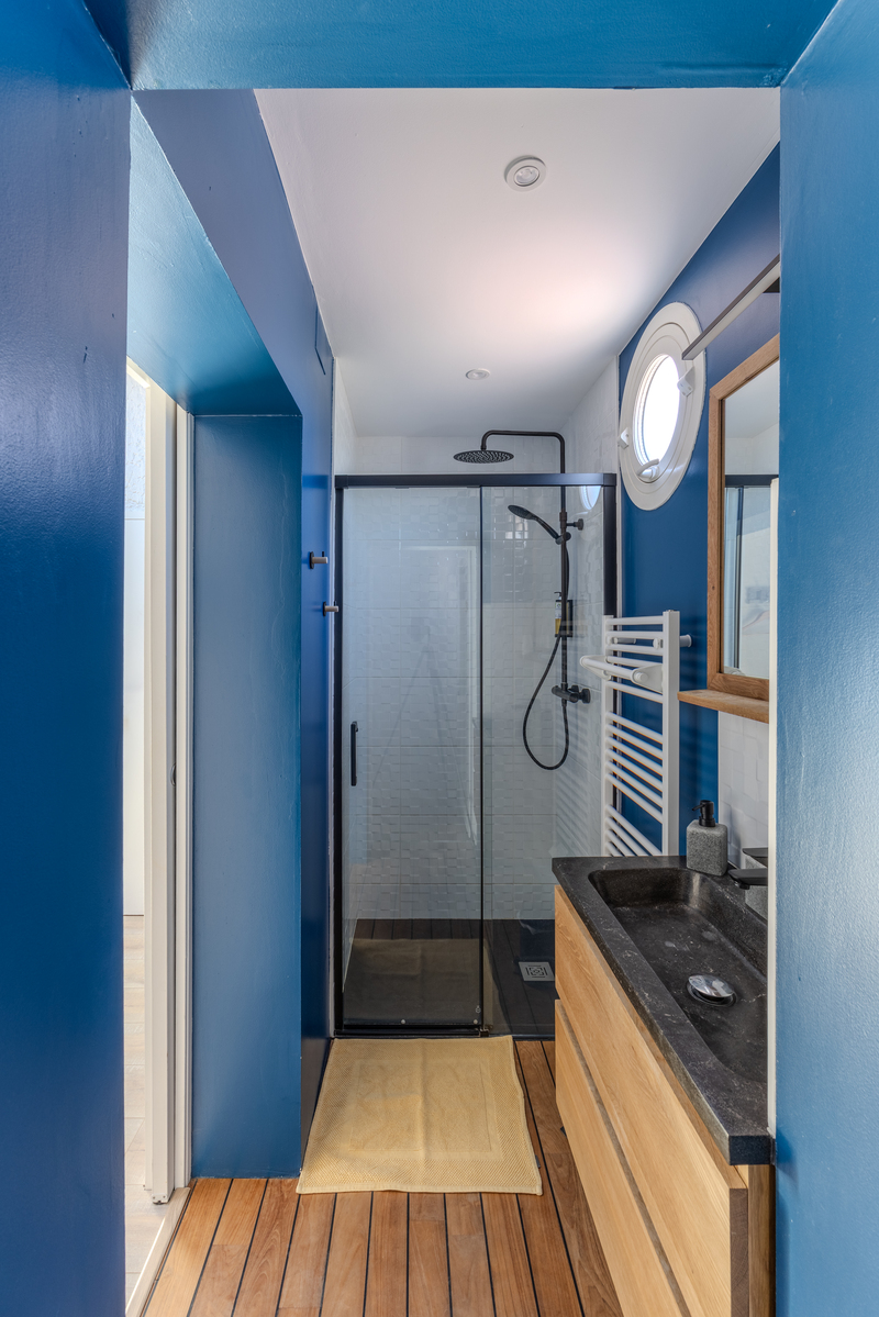 et de toilettes séparées. Avec ses hublots et son parquet en bois Teck Pont de Bateau, elle vous embarquera dans une ambiance de navigation entre les Iles.