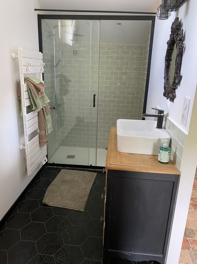Sèche cheveux, toilettes, douche, coin bureau, penderie, sèche-serviette