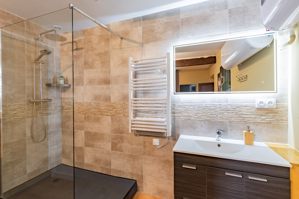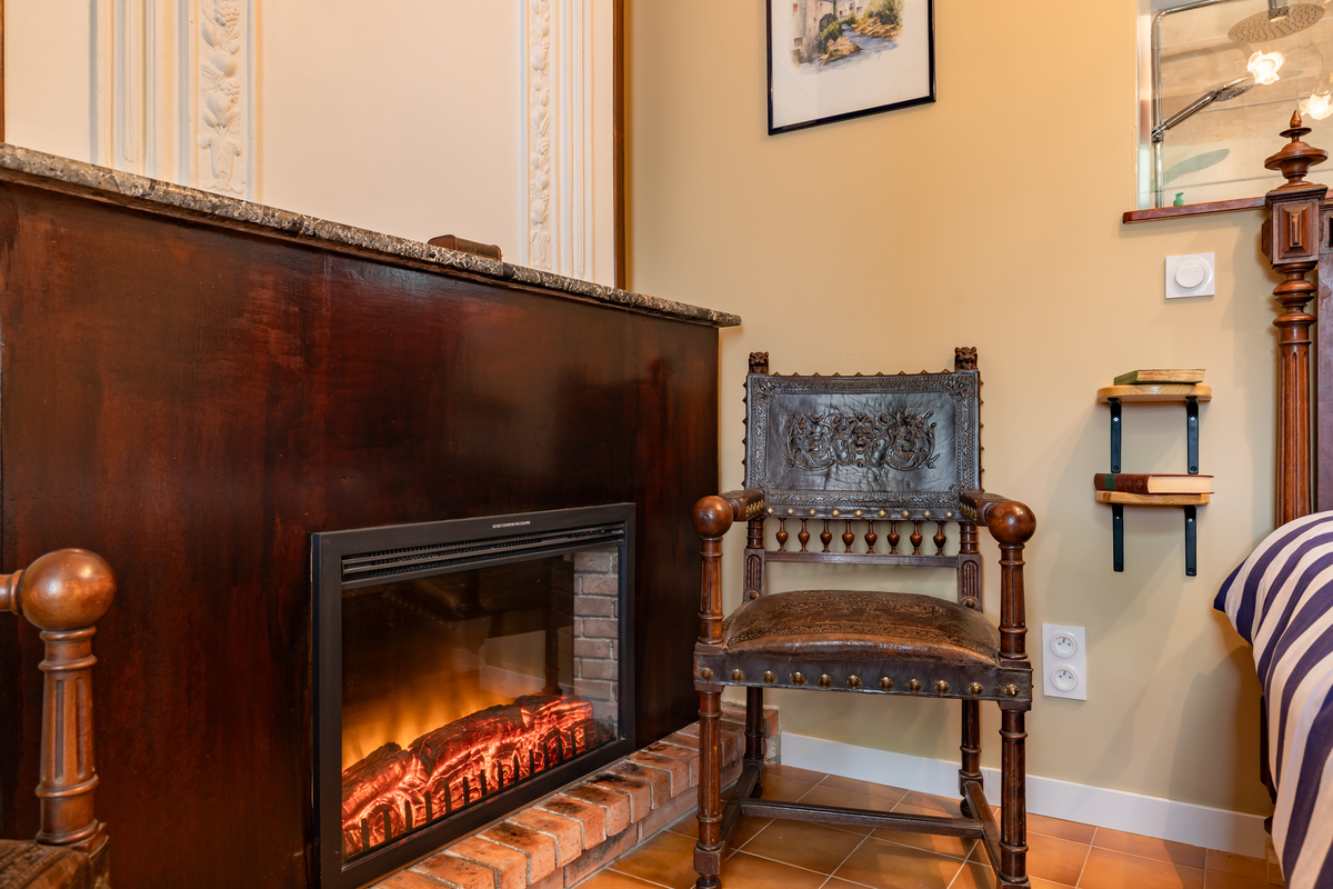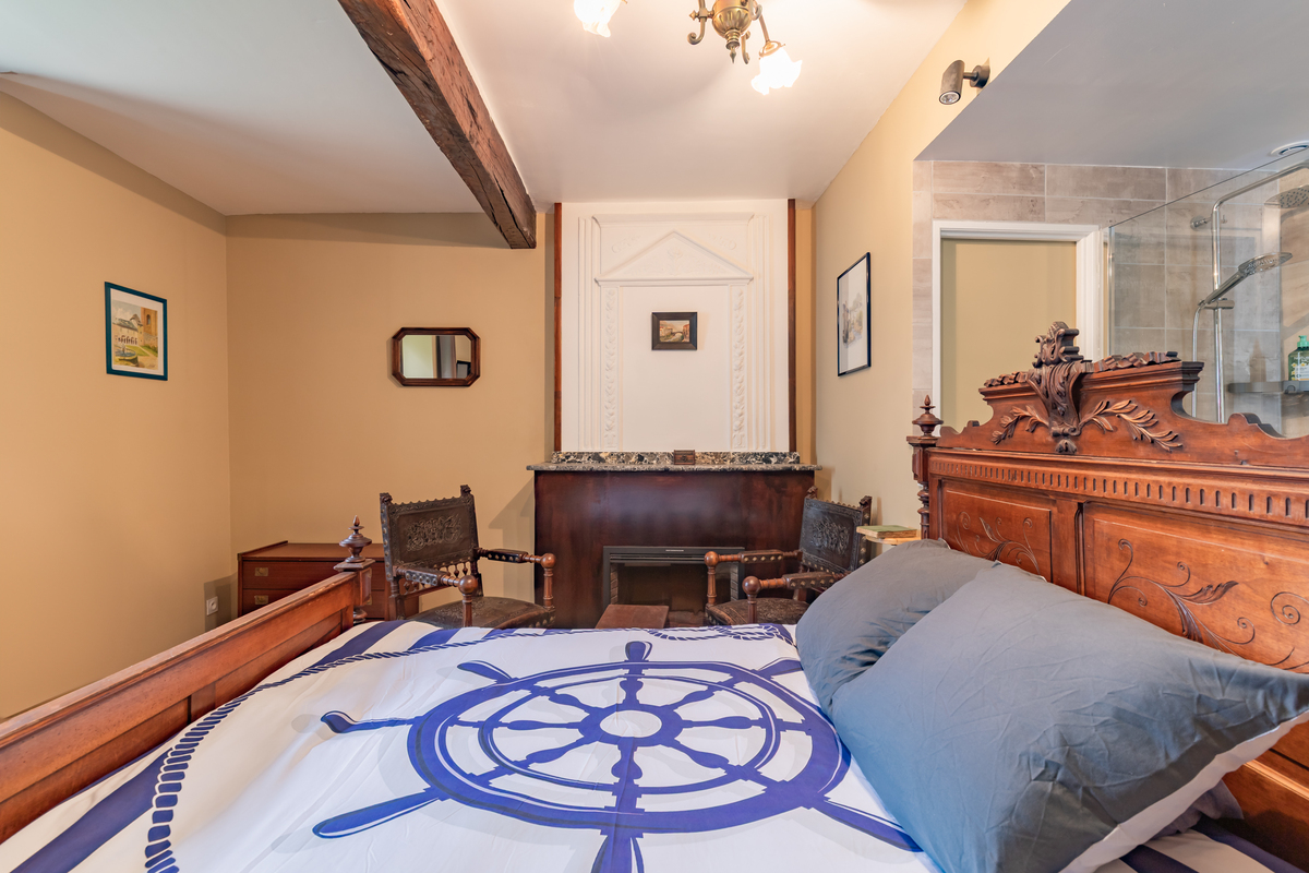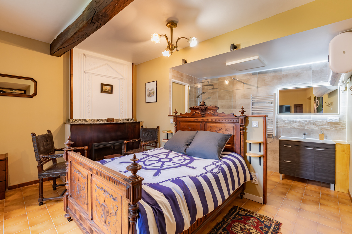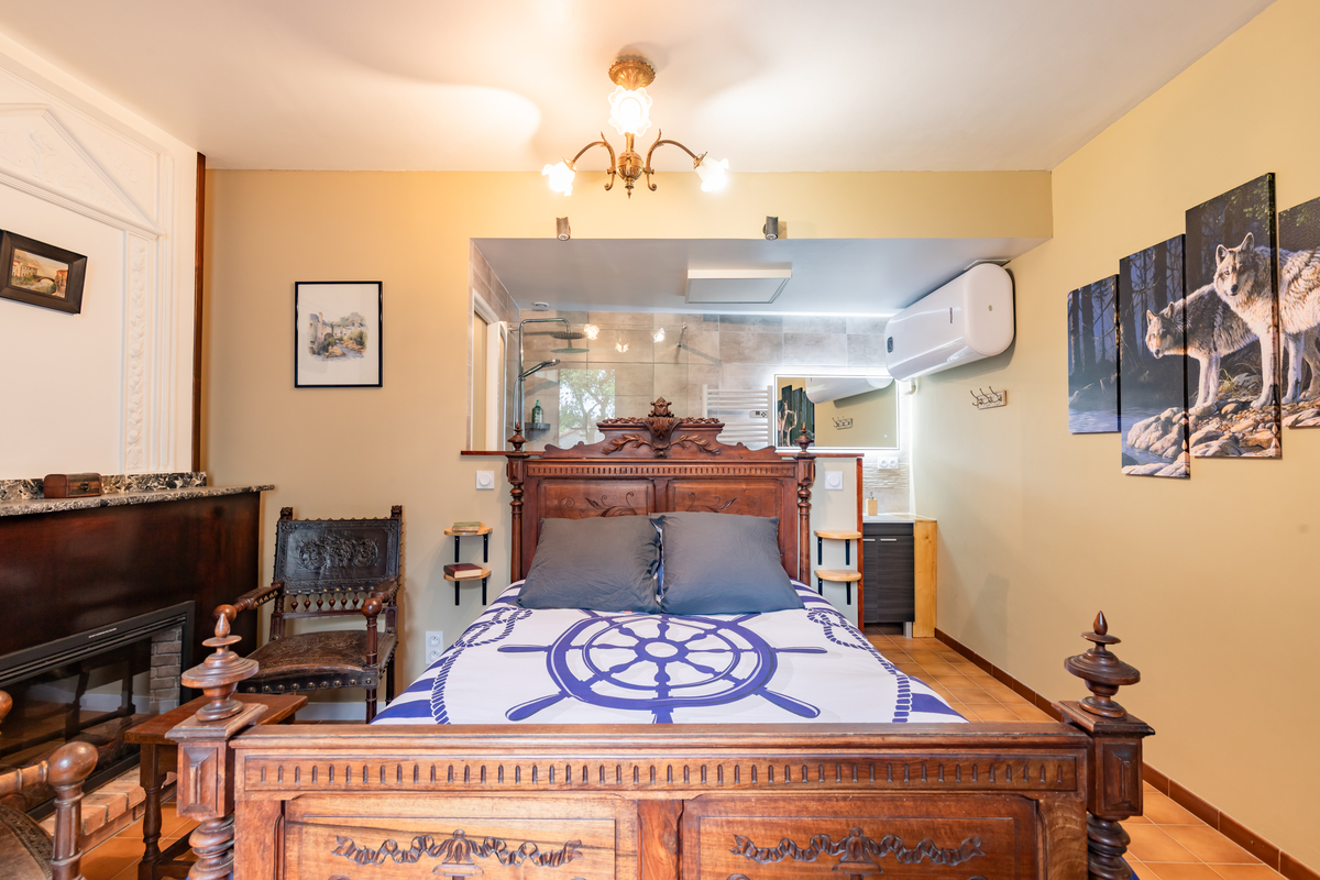 Chambre en rez-de-chaussée, naturellement fraîche l'été, lit ancien en 140, cheminée électrique, douche à l'italienne et toilettes privées, coin salon privé.
