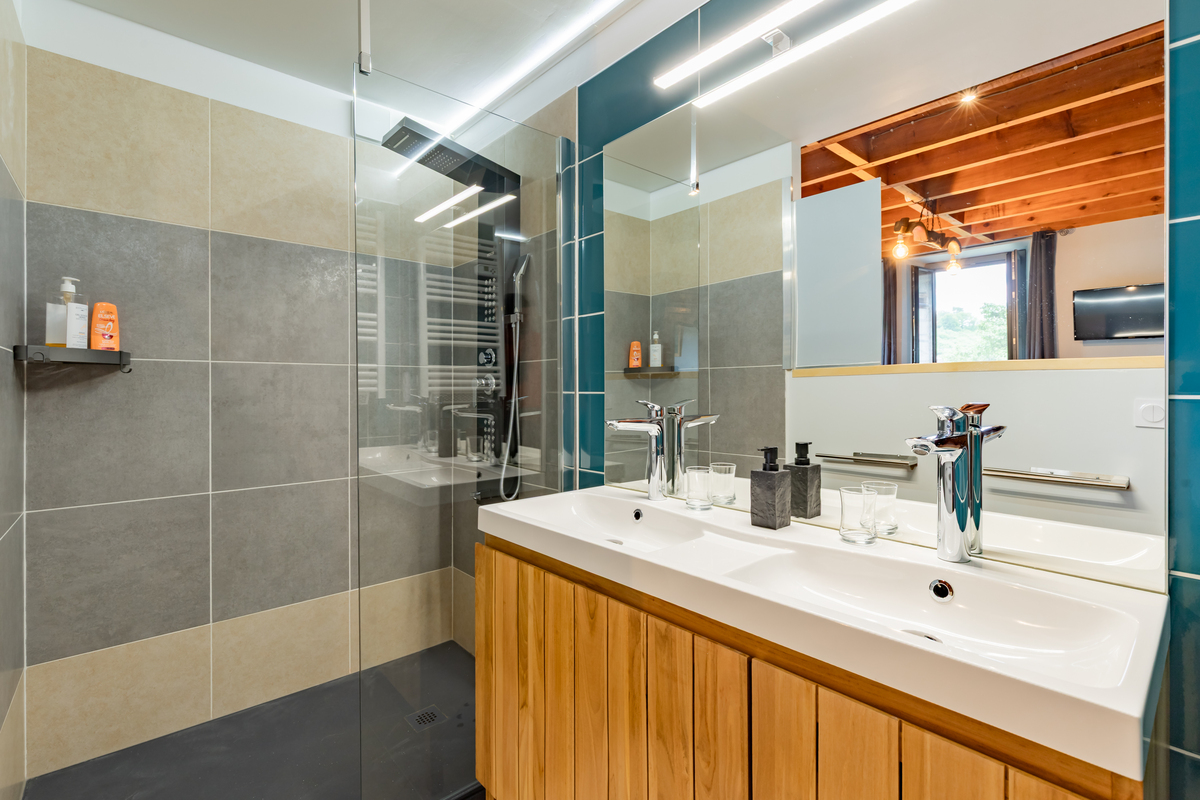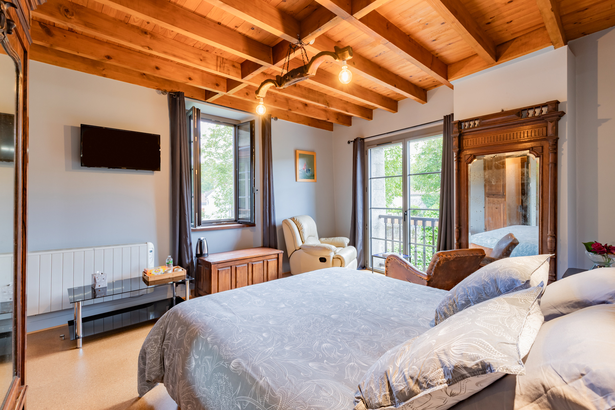 Chambre haut de gamme au premier étage avec lit en 160, douche à l'italienne avec jets de massage, double-vasque, balcon et coin salon privé.