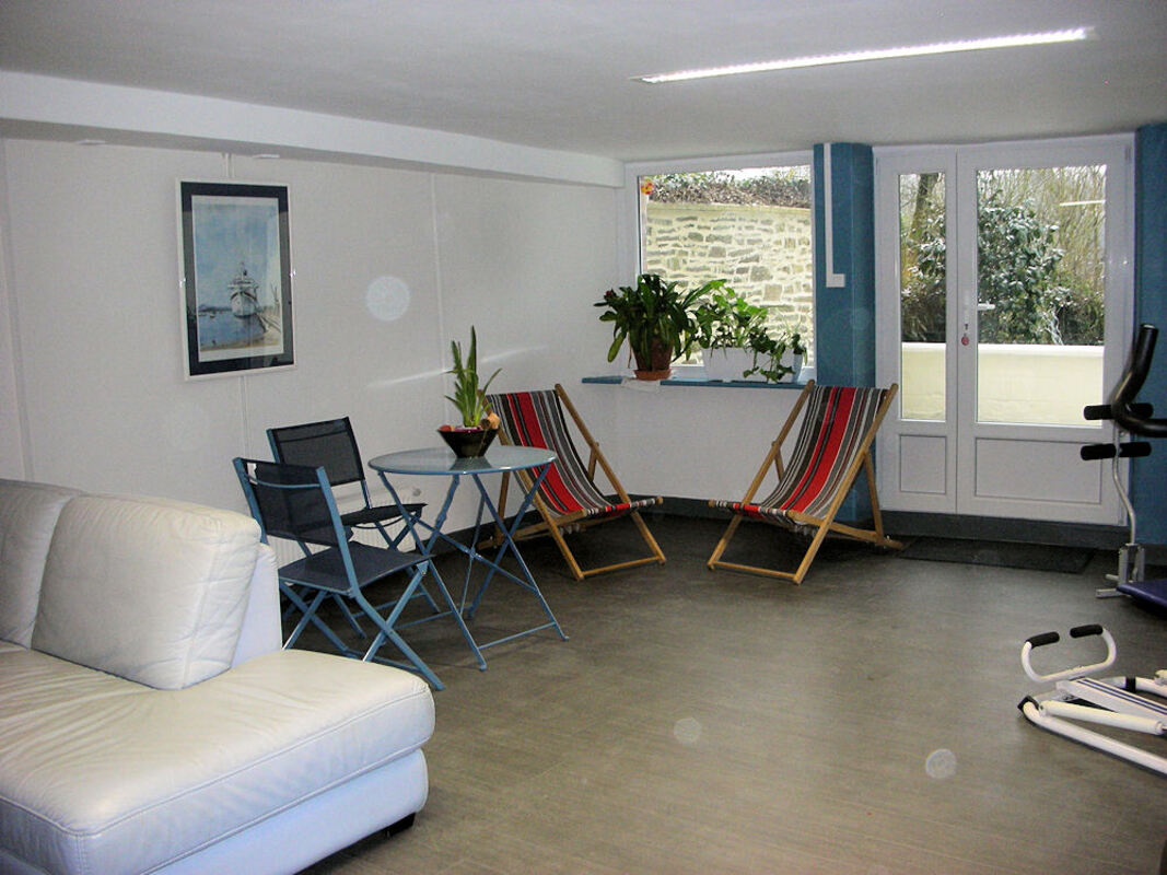 Le salon détente, rez-de-jardin, salon télé et appareils de sport.
