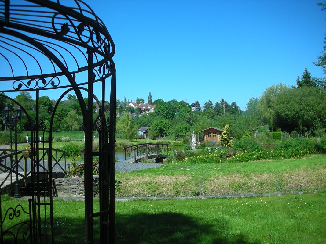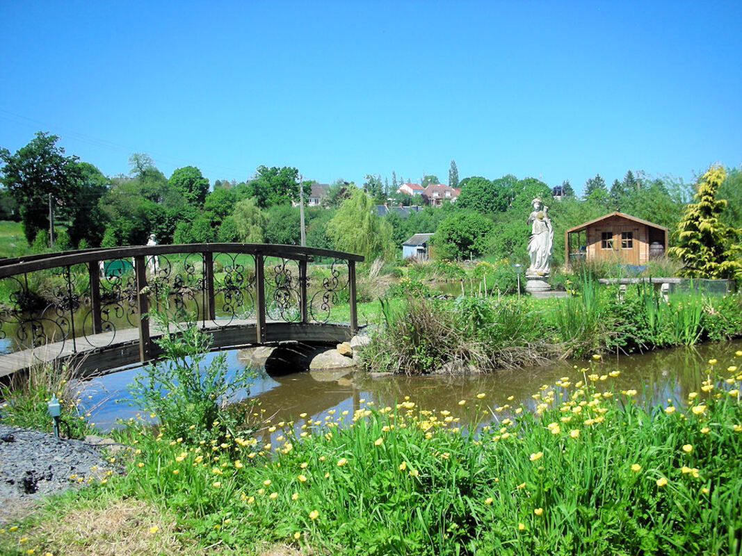 LA PRAIRIE, accès au fond du jardin, passage sur « LE TORTILLON », un demi hectare clos avec pièce d’eau, île sous le regard d’Apollon et d’Artémise, pour votre plaisir ; la cabane du jardin, la gloriette et la cabane à pêche.