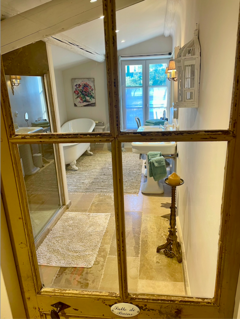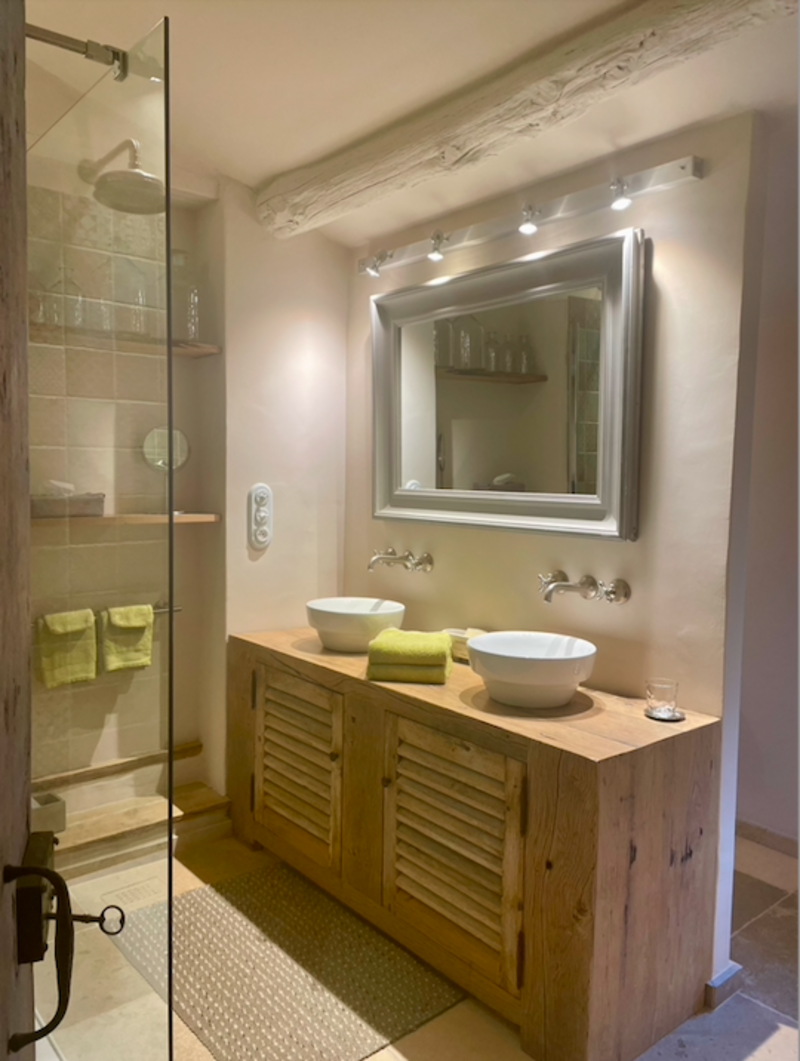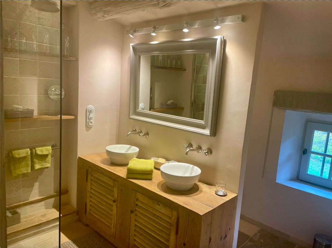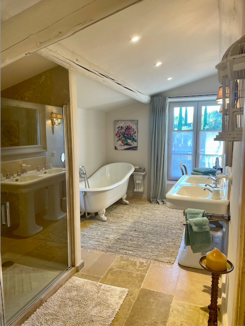 Chambre de 21 m² avec une grande salle de bain de 11 m² comprenant un lit double, douche/baignoire, WC. L'accès se fait par une entrée privative.