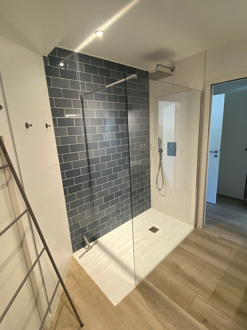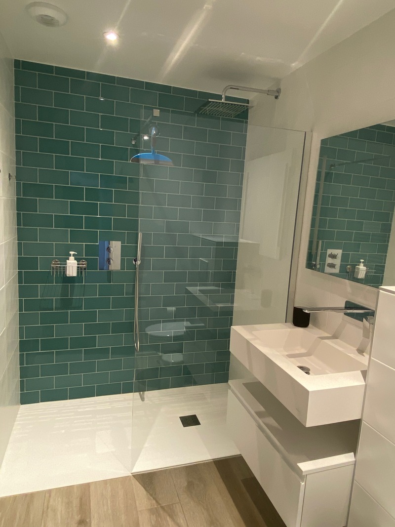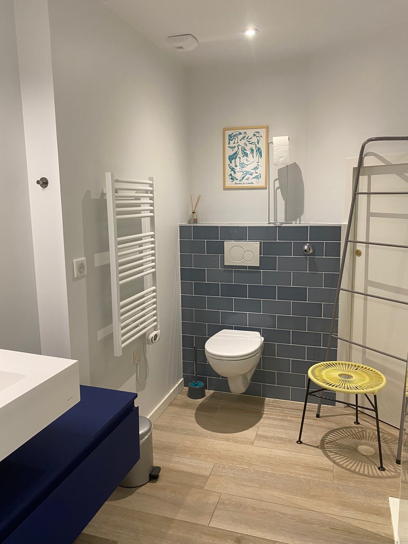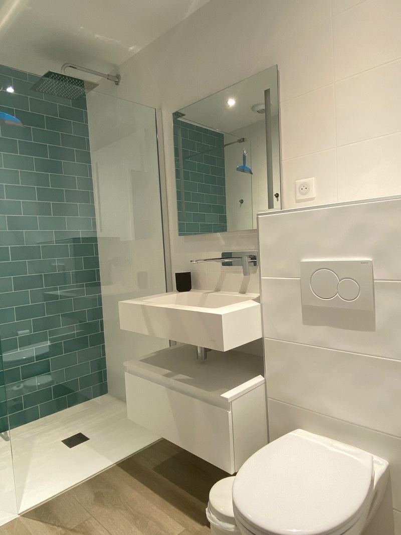 Chambre de 20 m2 disposant de sa propre salle de bain (douche à l’italienne, lavabo, toilettes , sèche-serviettes, sèche-cheveux), équipée d'un lit double 160 cm x 200 cm, d’un bureau, d’une télévision écran plat et de commodités pour le rangement.