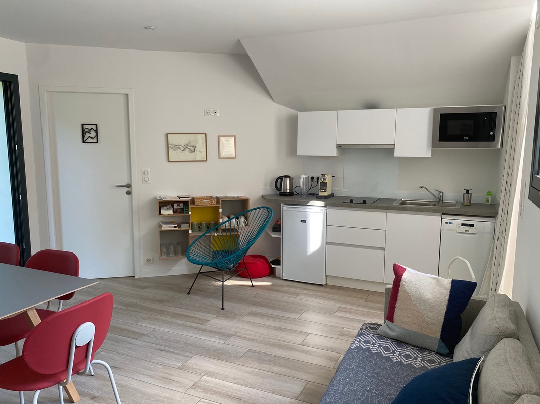 Au même niveau que les chambres, une pièce de séjour commune de 21 m2 est réservée aux hôtes , avec un coin cuisine équipé (réfrigérateur, plaques chauffantes, hotte aspirante, four micro-ondes, lave-vaisselle, cafetière, bouilloire, grille-pains, couverts et verres, vaisselle, ...).