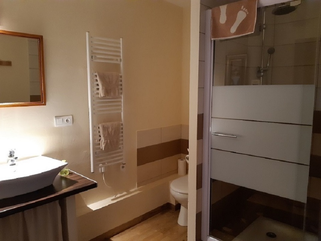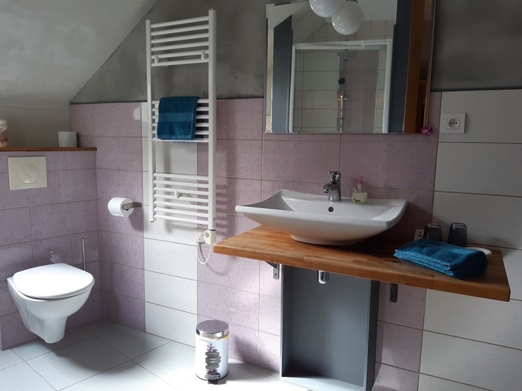Salle de bain à moitié ouverte, avec douche/WC et lavabo