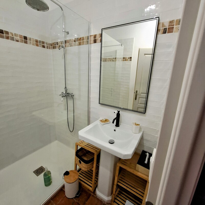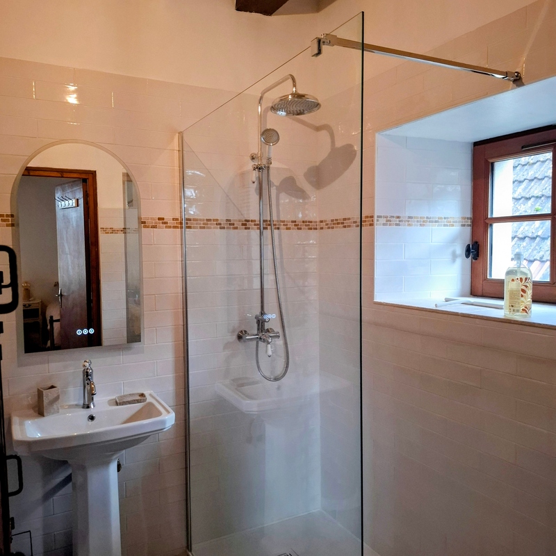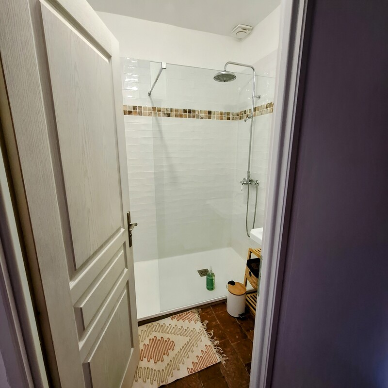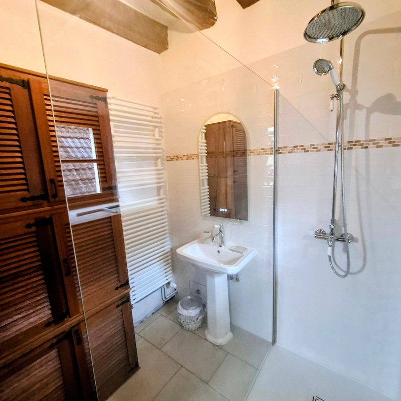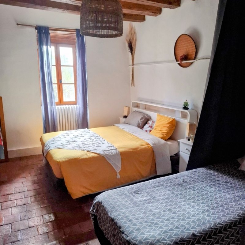 Chambre de 3 personnes comprenant un lit double de 160 / 200 cm et 1 lit simple de 90 / 180 cm, une salle de bain intérieure à la chambre est privative. Le cabinet de toilettes est commun aux 2 autres chambres.