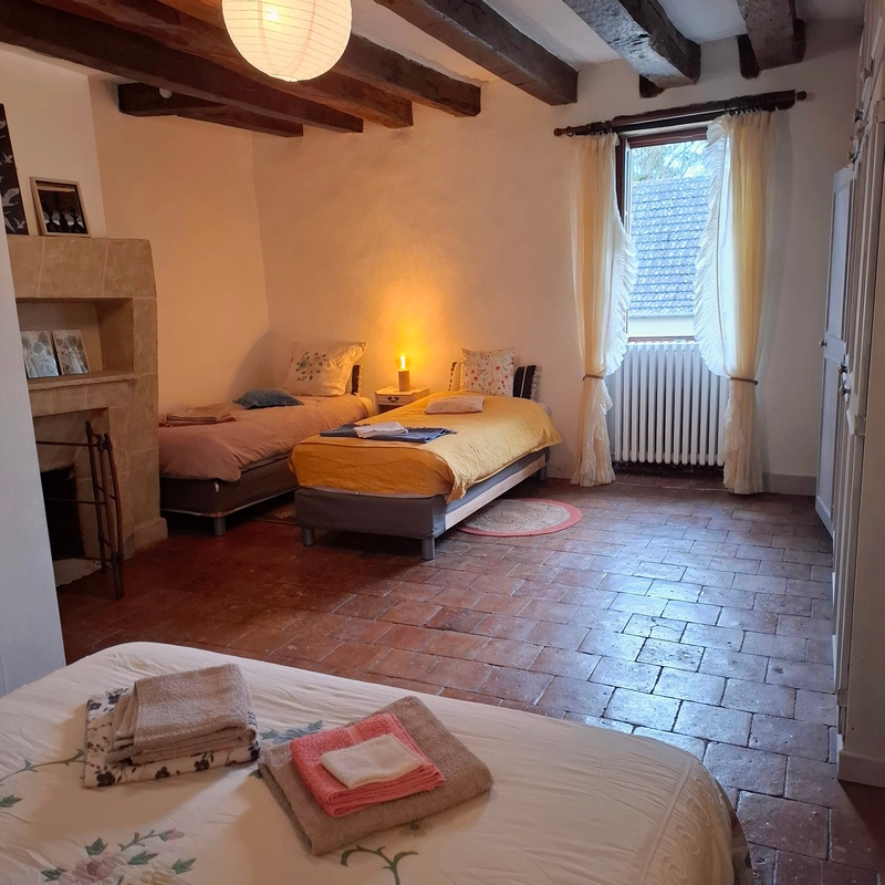 Cette grande chambre de 30 m2 est une suite parentale avec 3 lits pouvant accueillir 4 personnes.