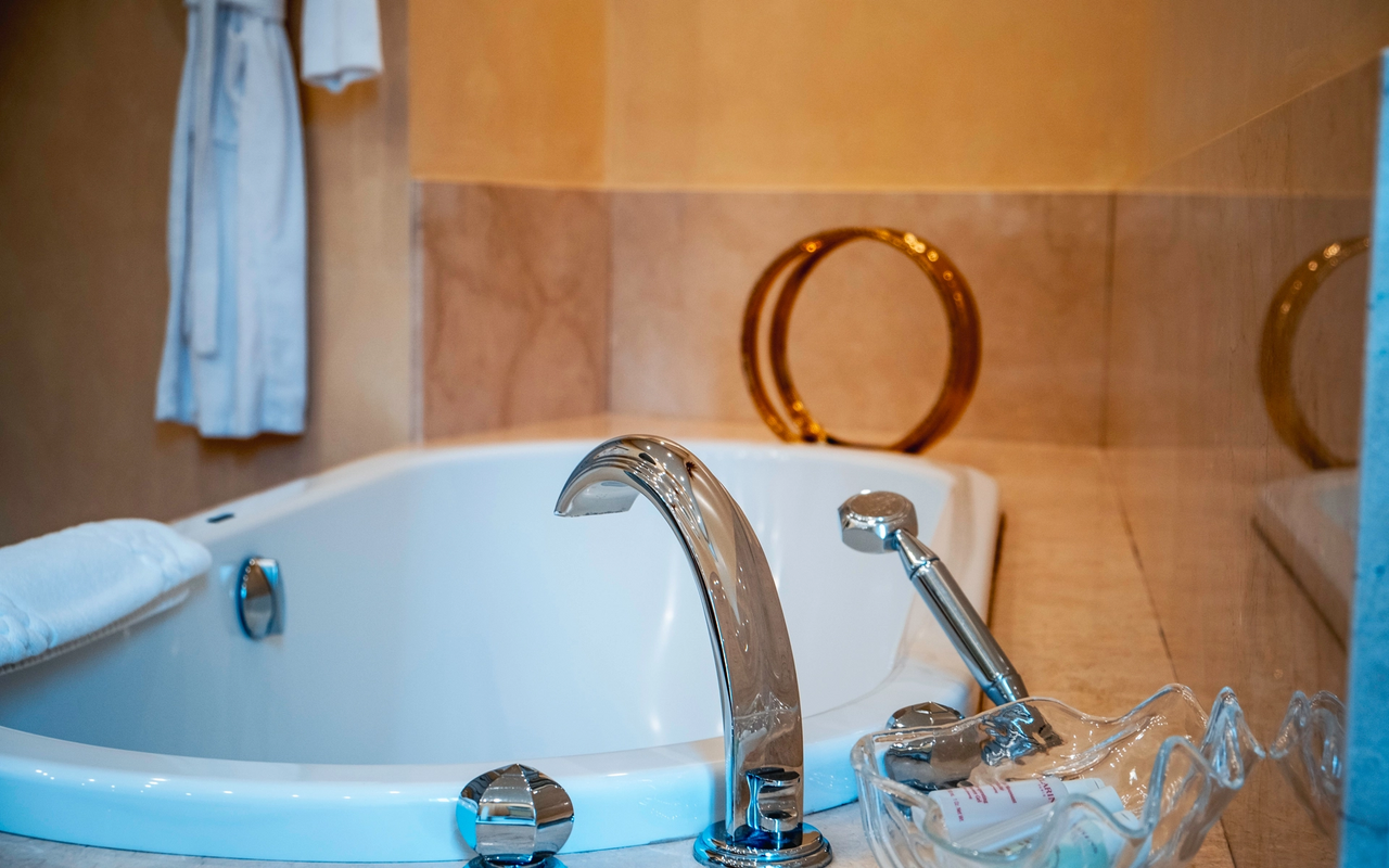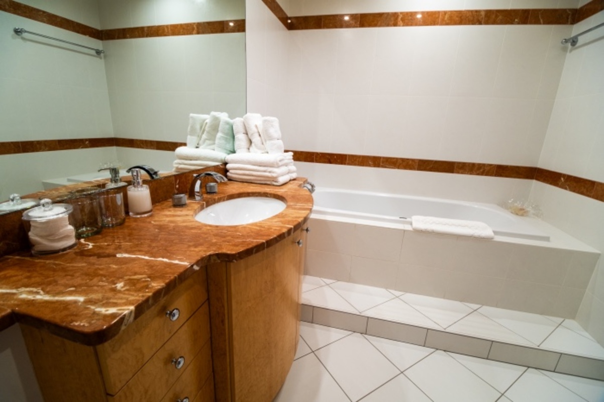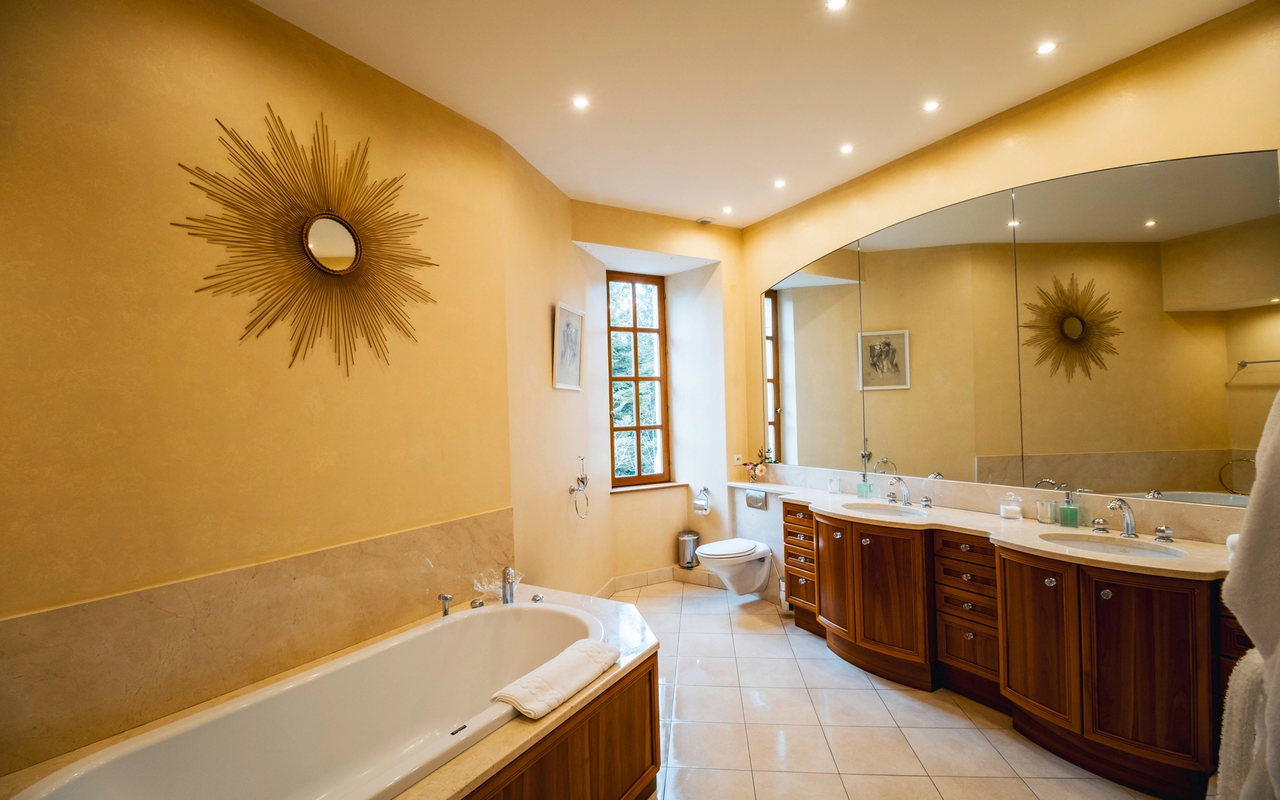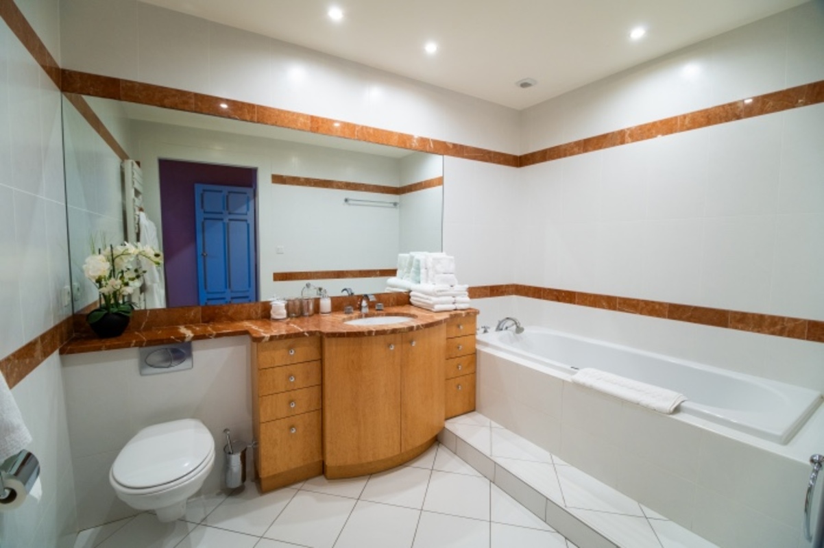 La salle de bains luxueuse vous invite à la détente, avec une baignoire élégante et une douche indépendante, réunies dans un espace conçu pour le bien-être absolu.
