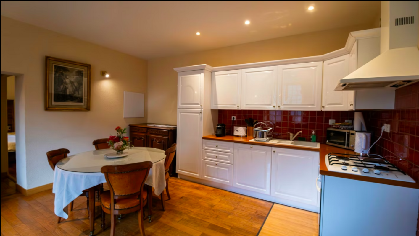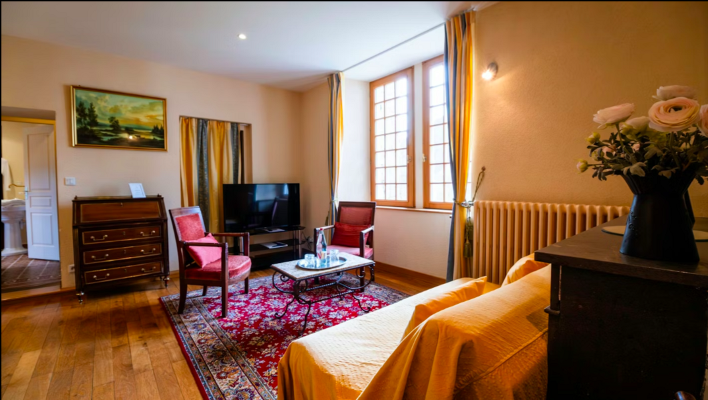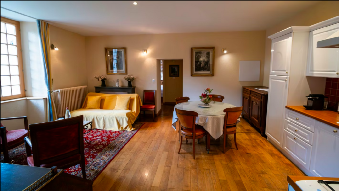 Depuis l’appartement, vous profiterez d’une vue directe sur la cour du château, véritable cœur vivant du domaine, qui ajoute une note de caractère et d’authenticité à l’expérience.