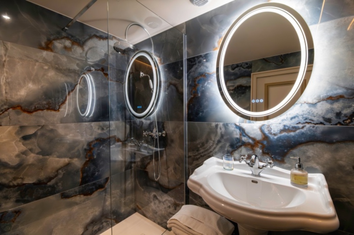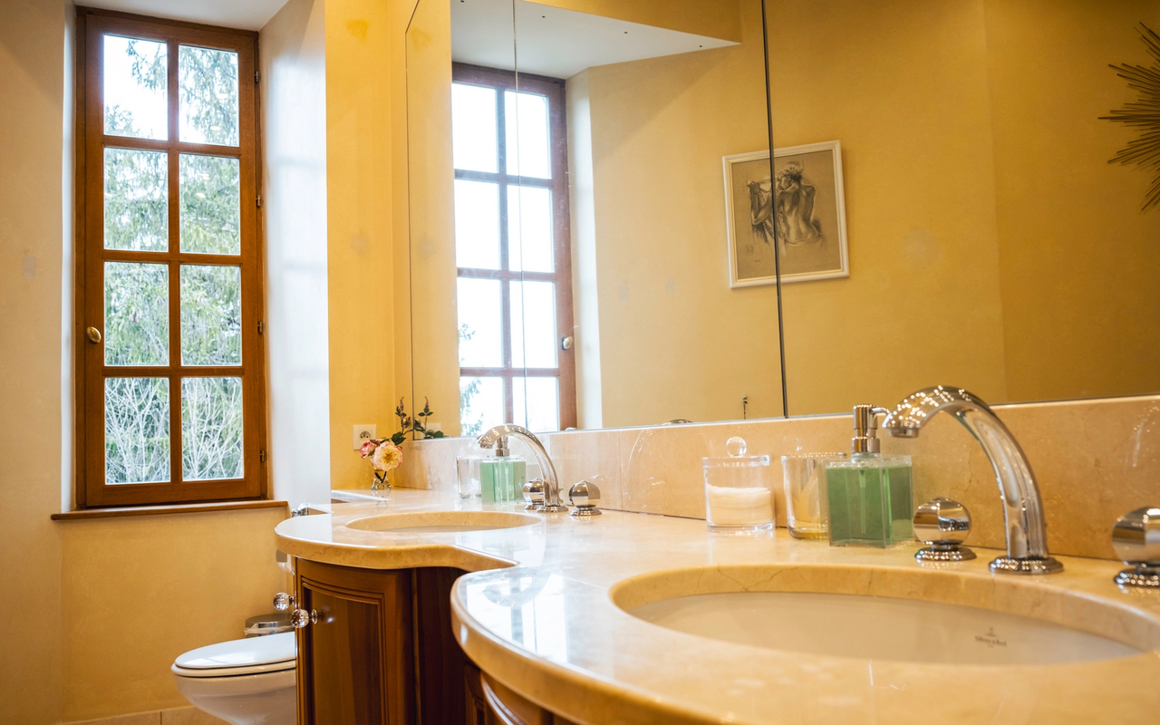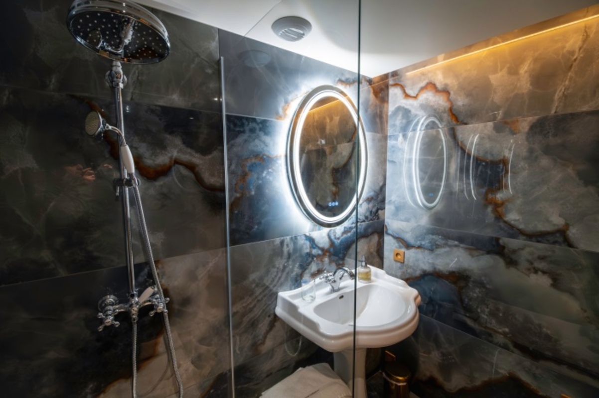 Sa salle de bains en marbre, sobre et élégante, offre un confort haut de gamme, entre matières nobles et lignes intemporelles. Chaque détail y est pensé pour créer une atmosphère de détente et de distinction.