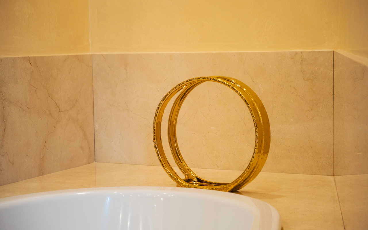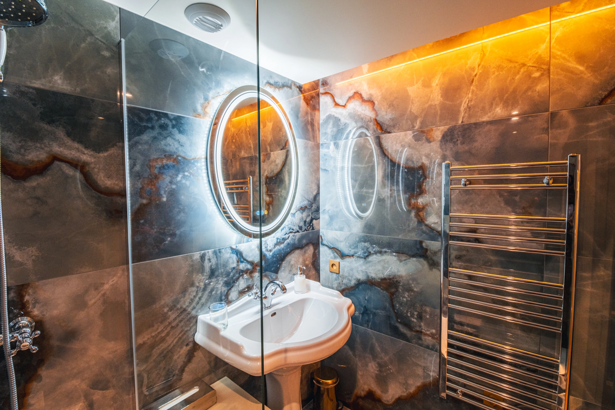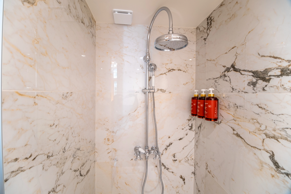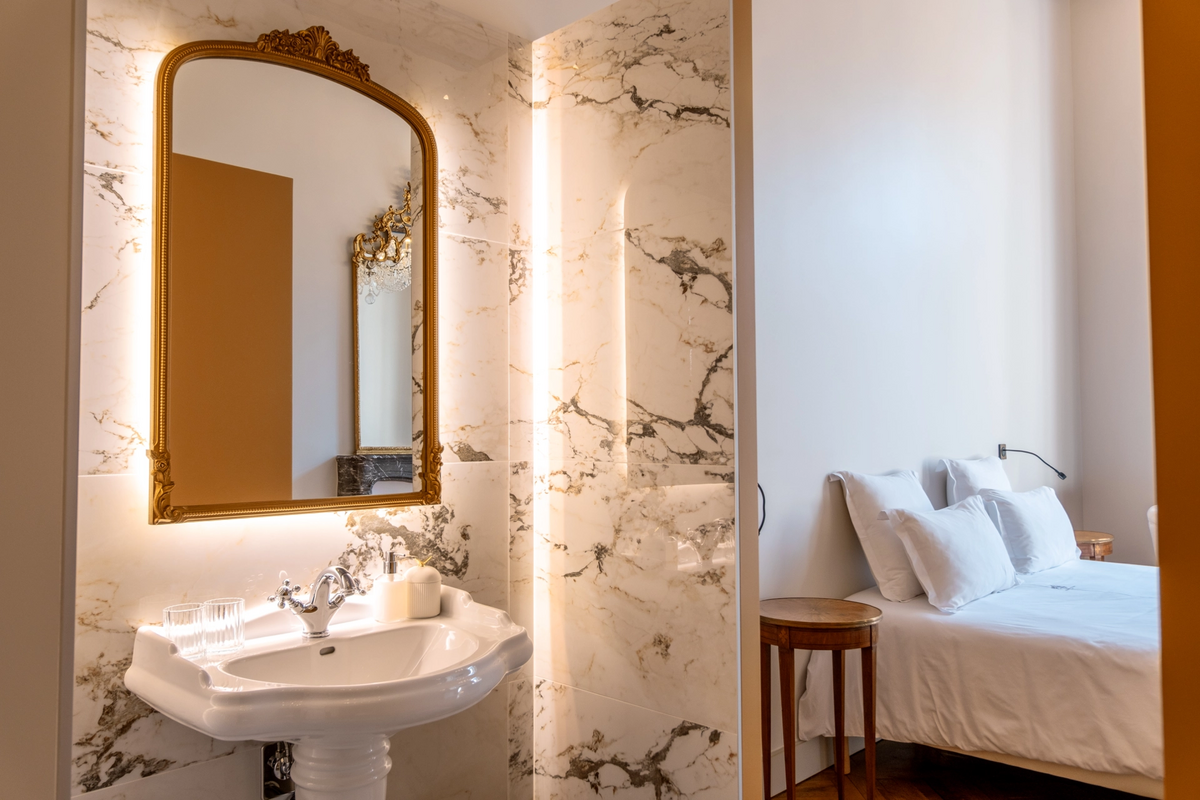 Sa salle de bains en marbre, sobre et élégante, offre un confort haut de gamme, entre matières nobles et lignes intemporelles. Chaque détail y est pensé pour créer une atmosphère de détente et de distinction.