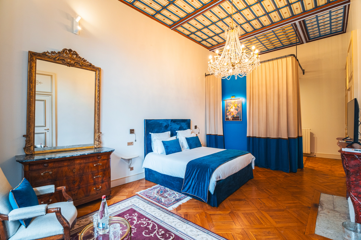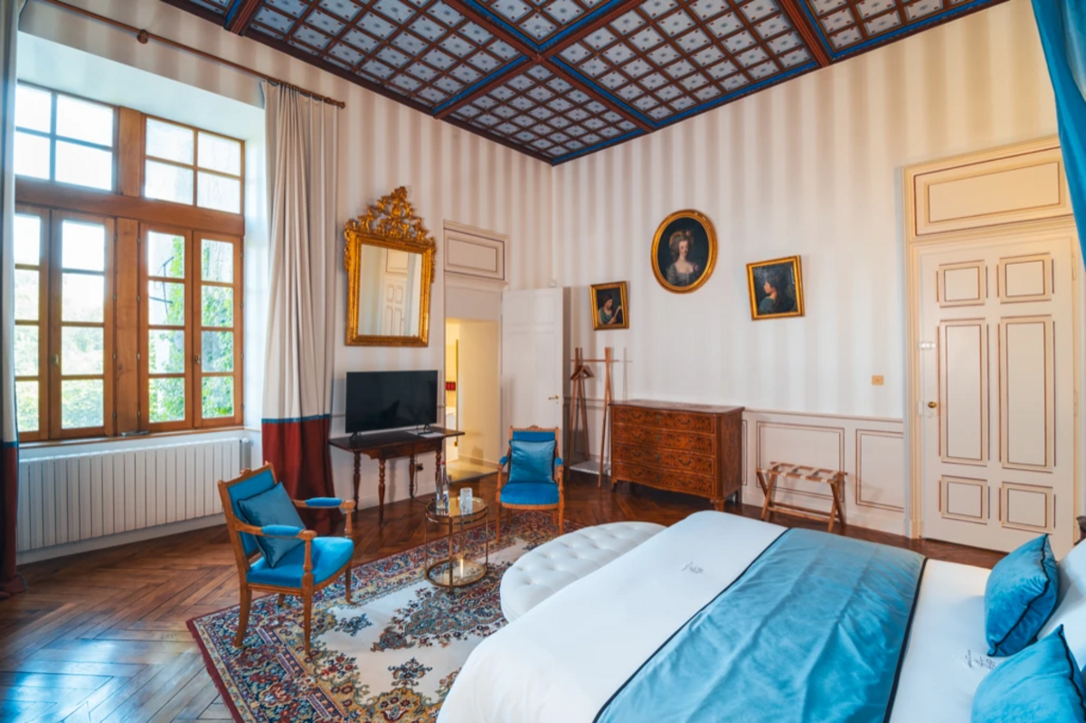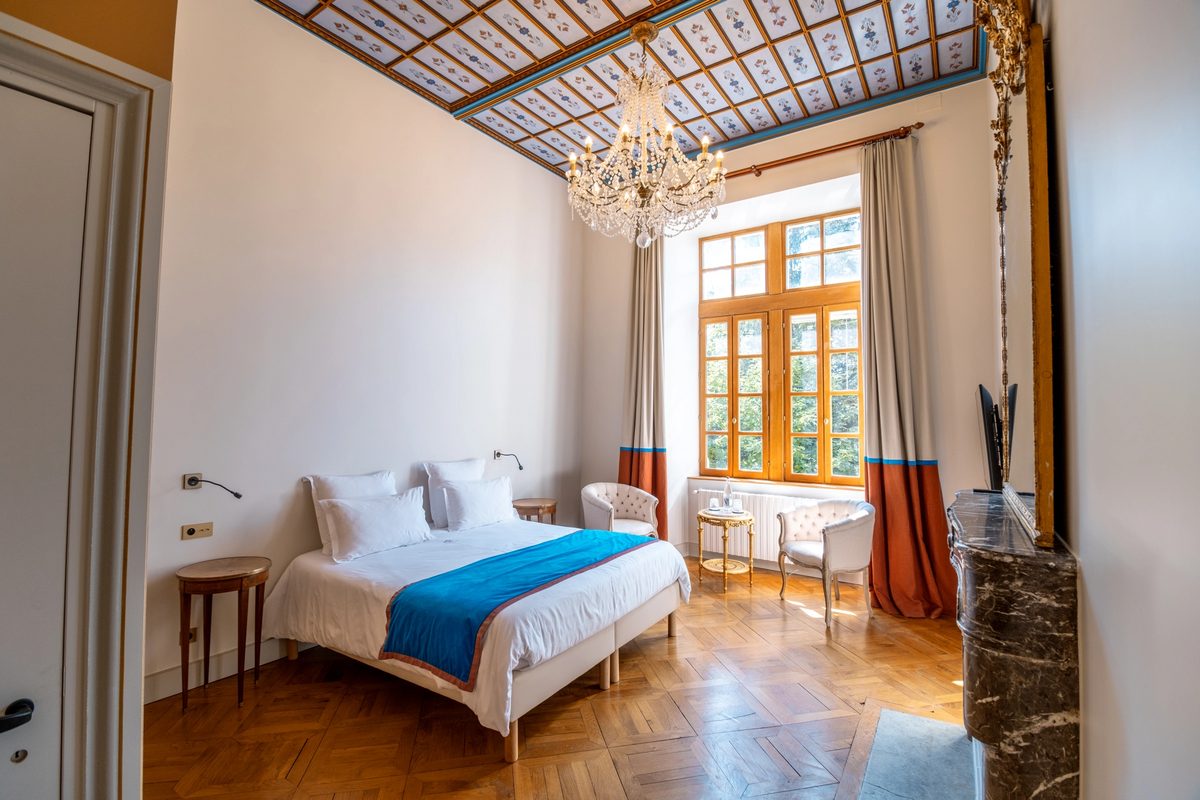 Les chambres et suites, toutes uniques, rendent hommage aux figures marquantes de l’histoire du domaine. Elles allient charme d’époque et confort, avec de nombreux éléments d’origine soigneusement conservés : plafonds anciens, mobilier authentique et détails architecturaux qui témoignent du passé prestigieux des lieux. Chaque espace a été pensé pour offrir une atmosphère chaleureuse et élégante.