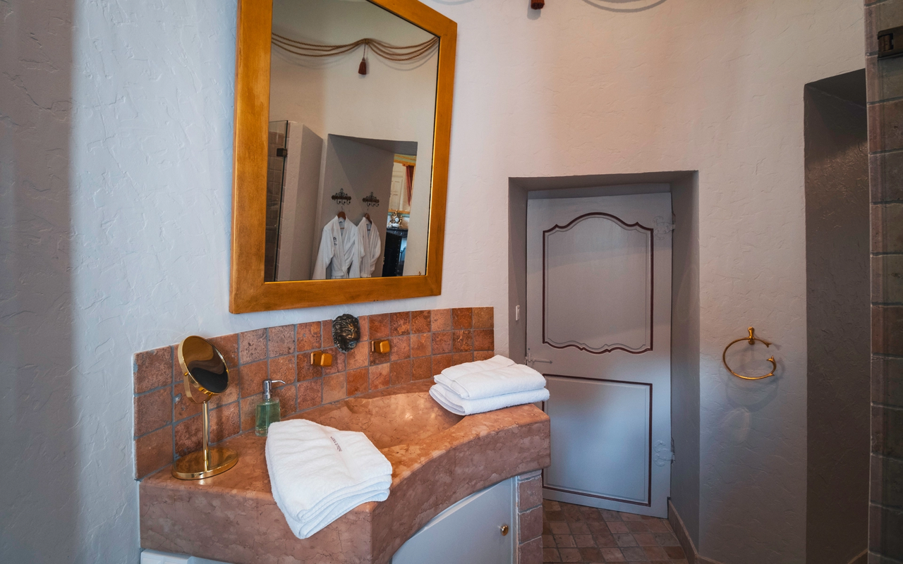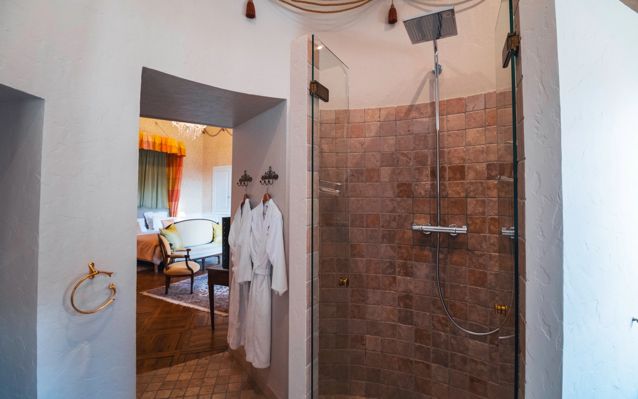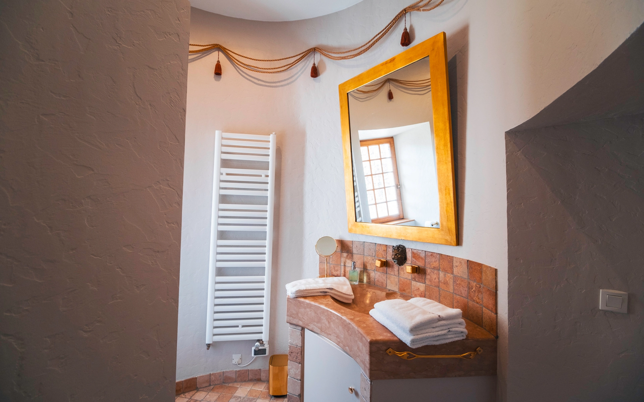 Sa salle de bains singulière, nichée dans l’une des tours du château, ajoute une touche insolite à votre séjour : une douche au cachet unique, entre pierre, lumière et mémoire des lieux.