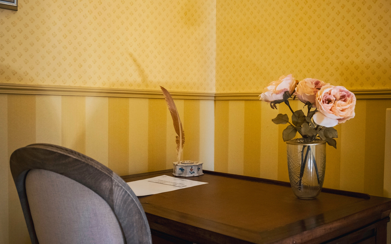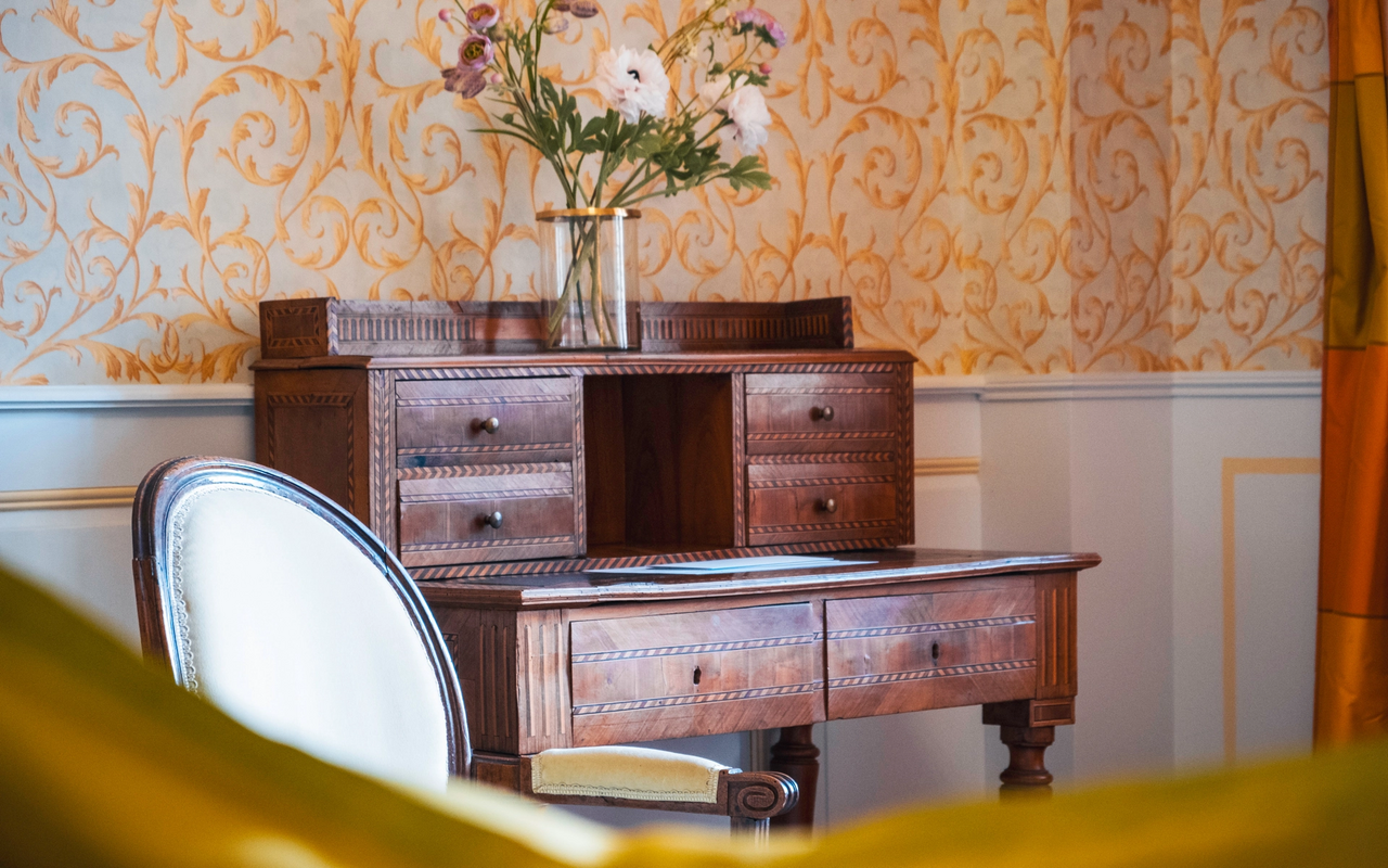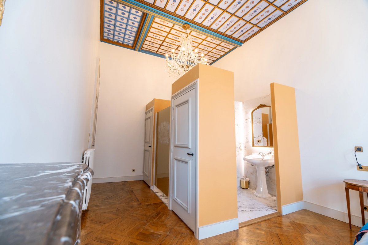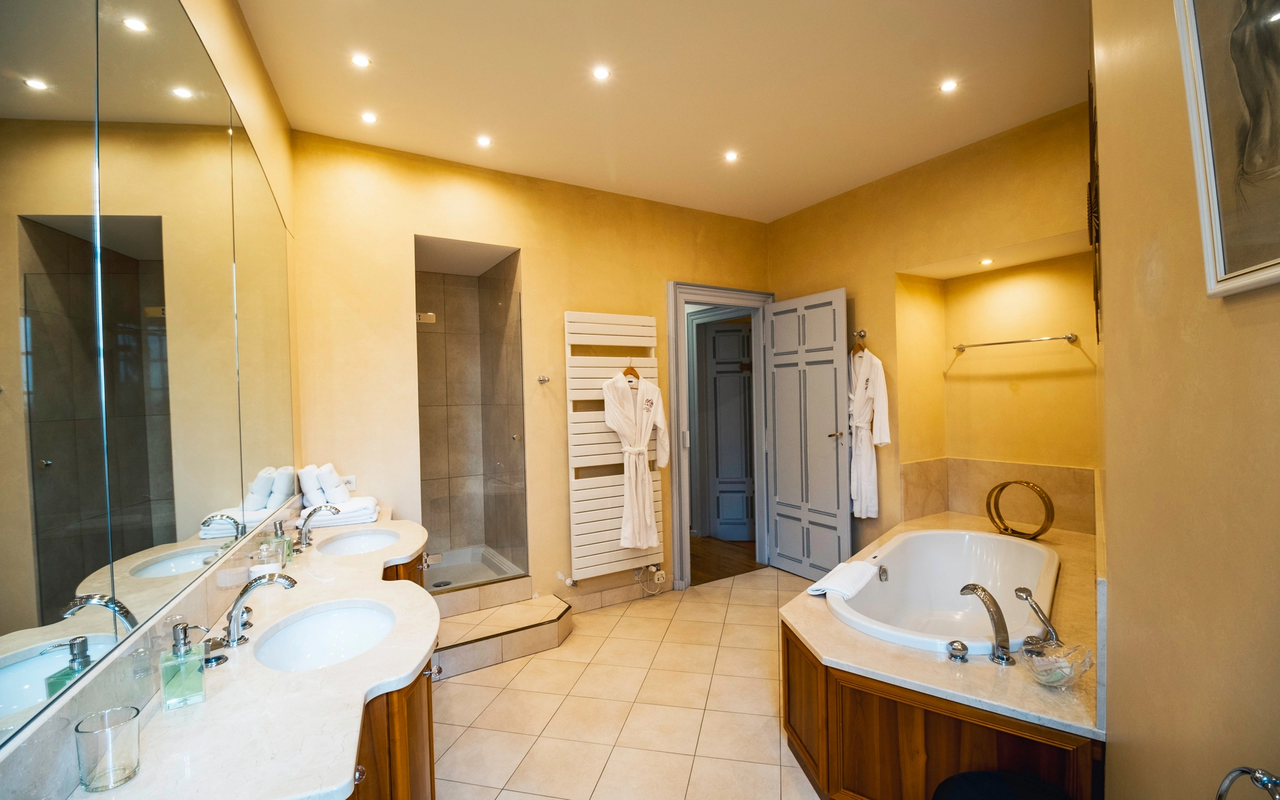 La chambre dispose d’une vaste salle de bains, idéale pour prendre le temps, se détendre et savourer l’instant. Son grand bureau en fait également un espace parfaitement adapté aux séjours prolongés, à l’écriture ou à la réflexion, dans une ambiance studieuse et inspirante.