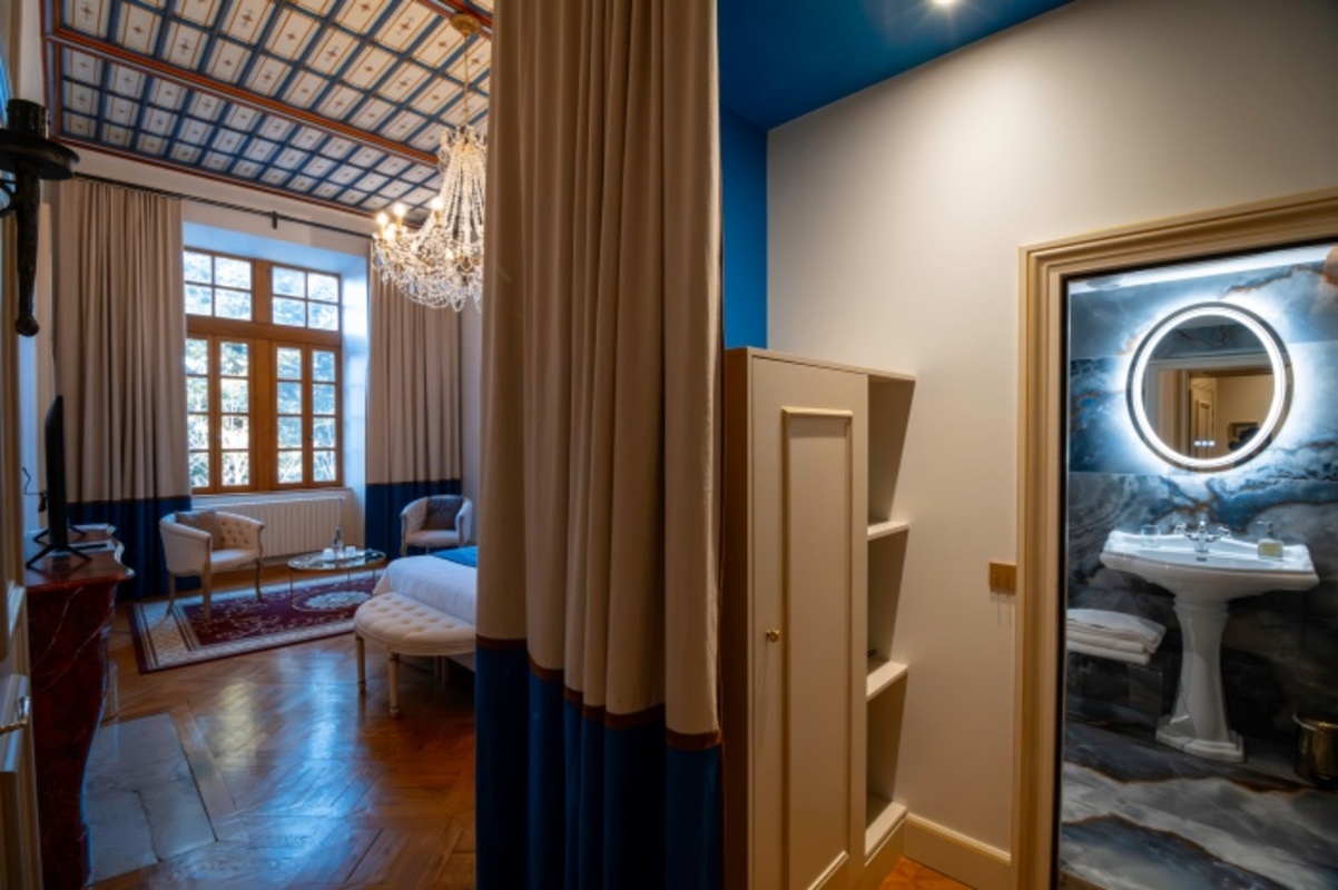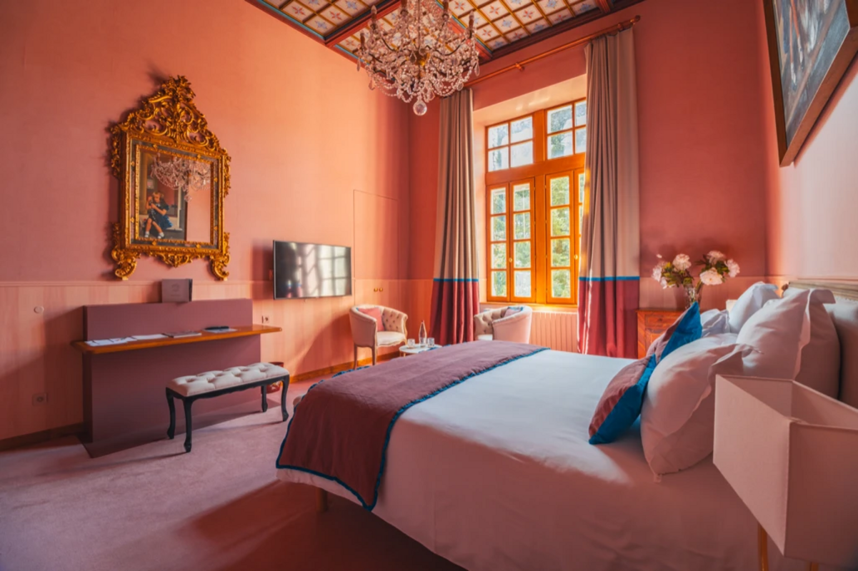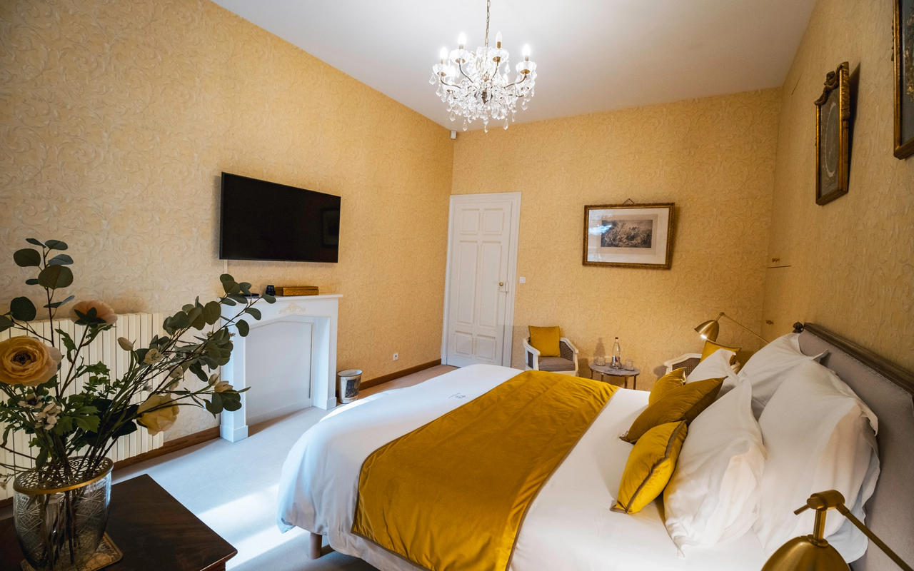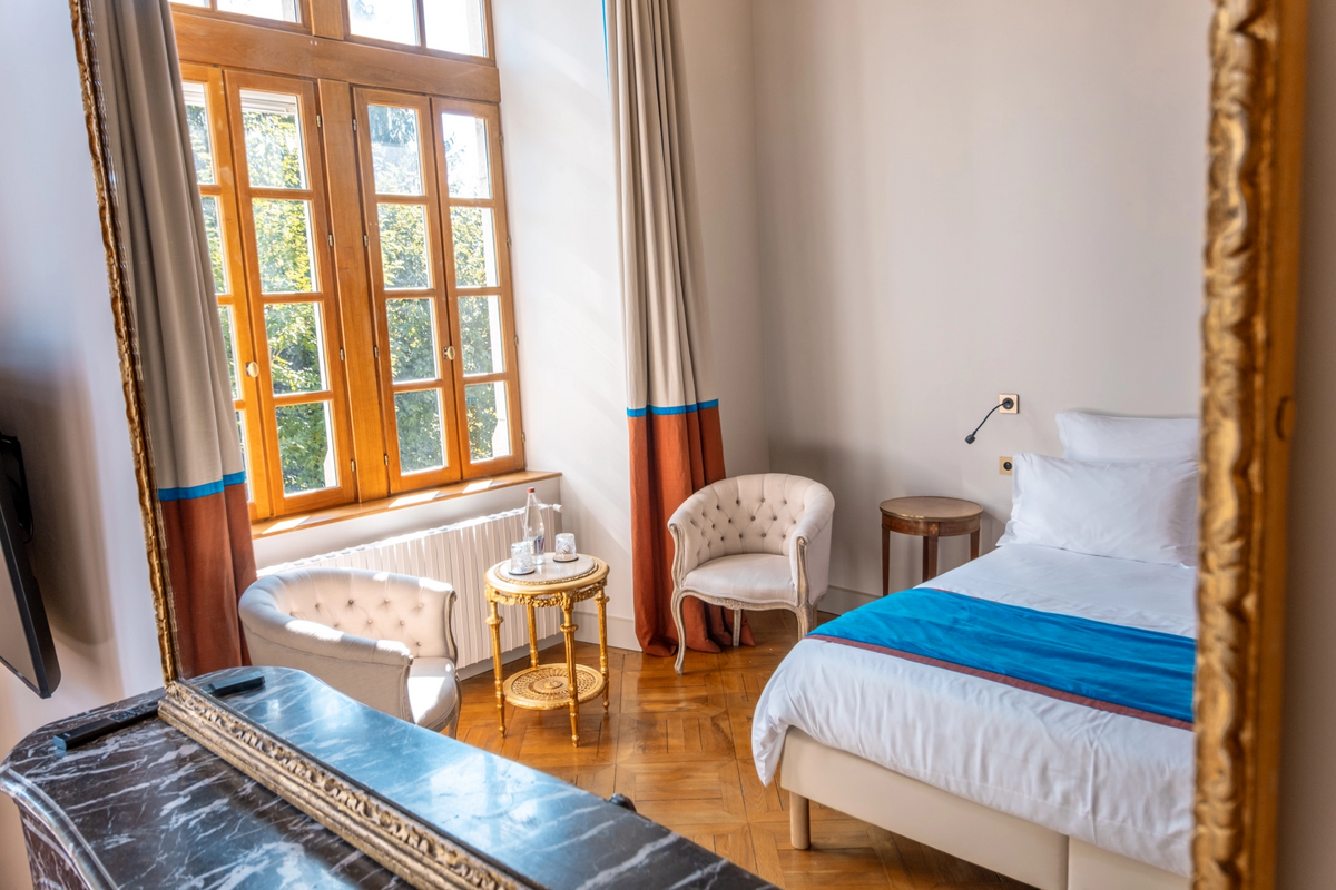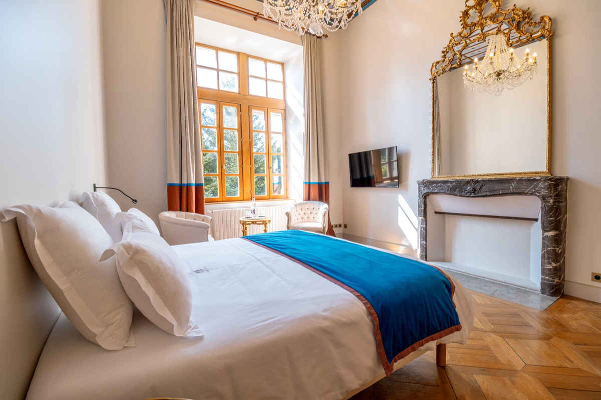 La Chambre Comtesse Pauline incarne une vision plus contemporaine du raffinement, tout en respectant l’âme historique des lieux. Créée récemment dans le château, elle allie modernité, confort et lumière avec subtilité.