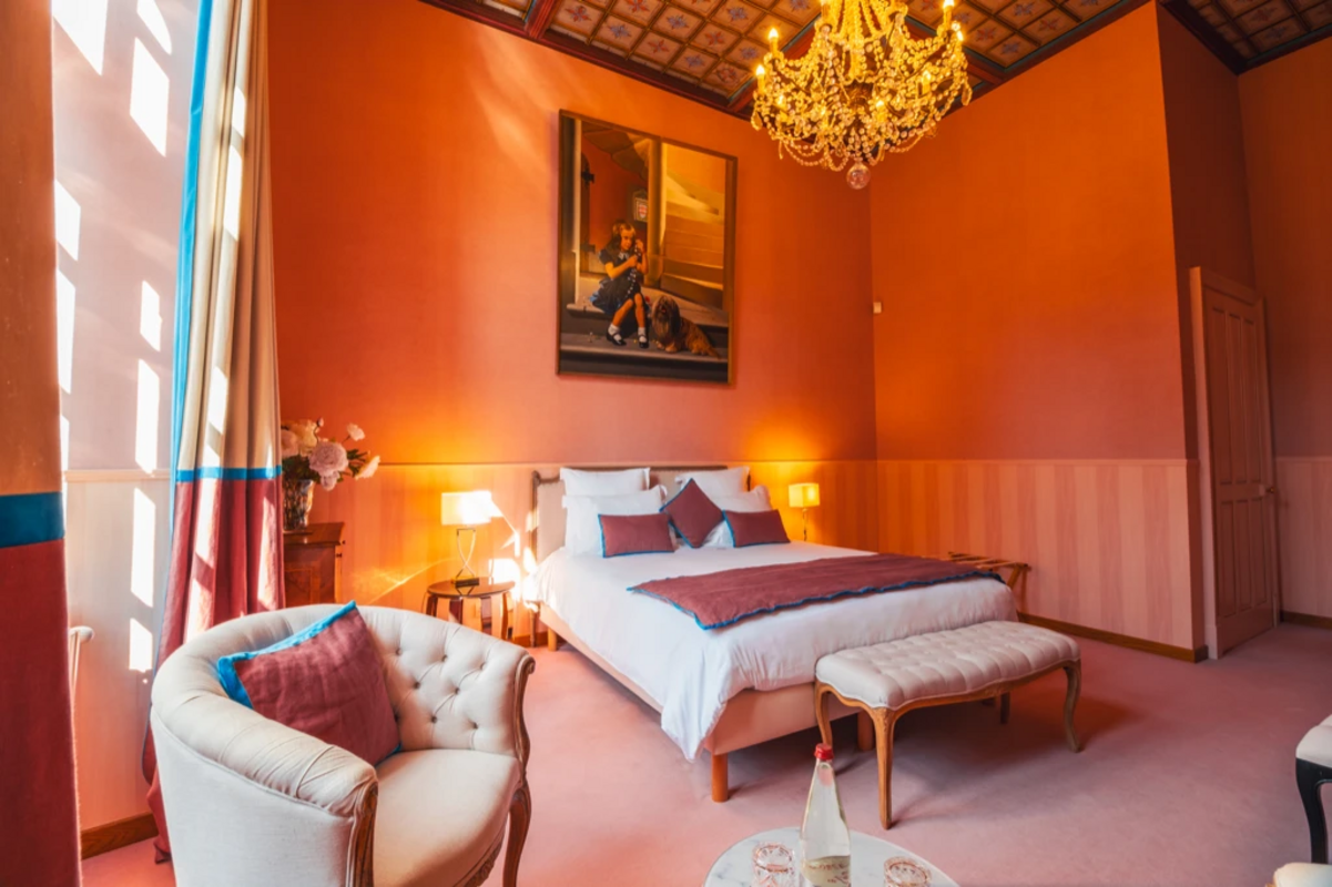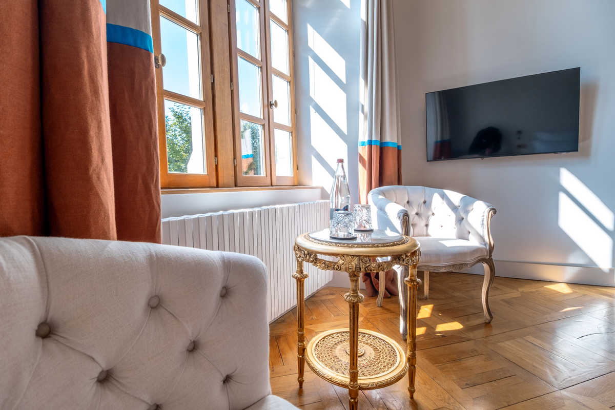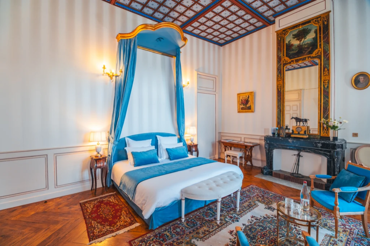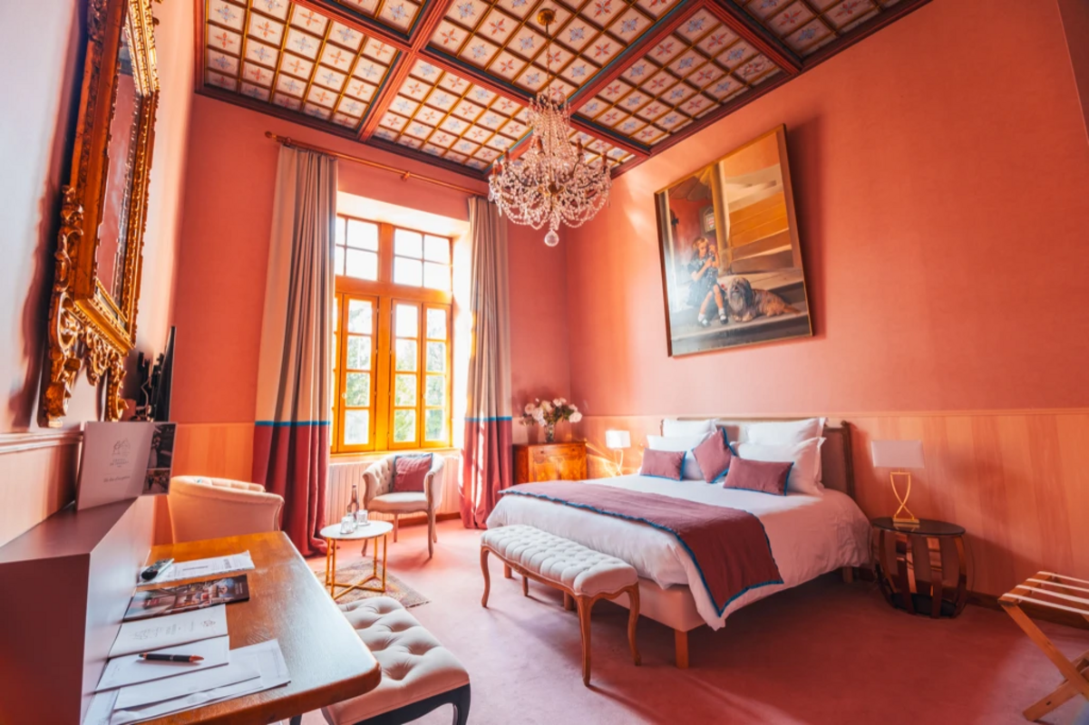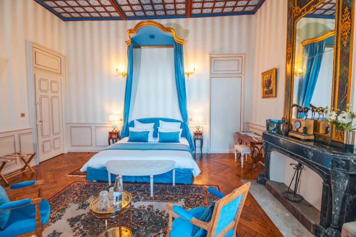 La Chambre Comtesse Pauline incarne une vision plus contemporaine du raffinement, tout en respectant l’âme historique des lieux. Créée récemment dans le château, elle allie modernité, confort et lumière avec subtilité.