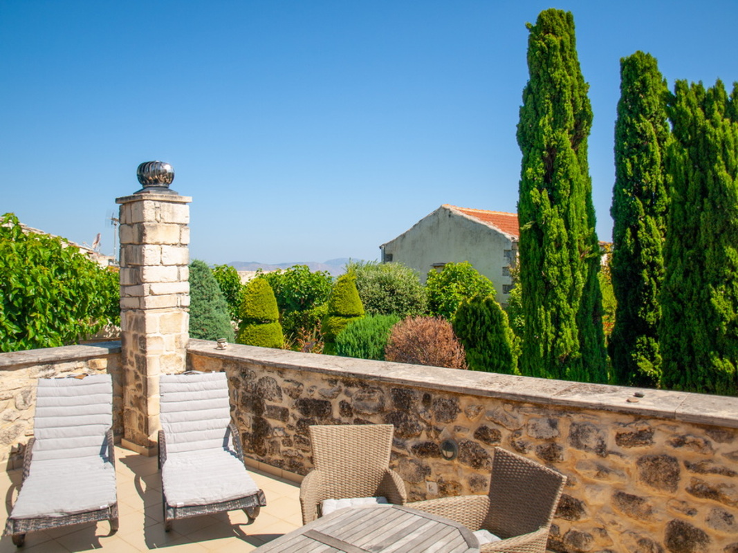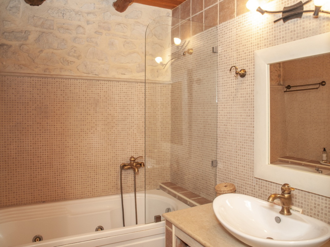 A l’étage, 1 chambre (lit double), 1 chambre (2 lits simples), salle de bains (baignoire jacuzzi/wc), terrasse aménagée, vue village.