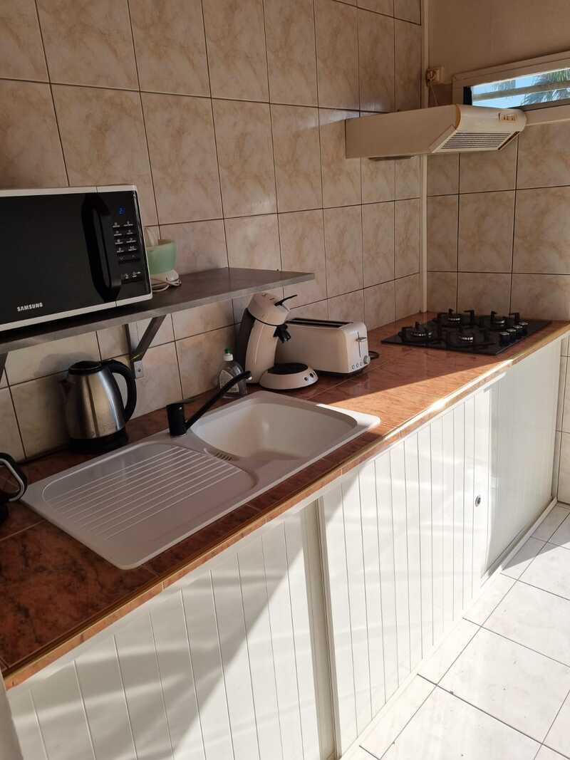 Cuisine : cuisinière à gaz et four, micro-ondes, machine à café, grille pain, cuiseur à riz, lave vaisselle et frigo.