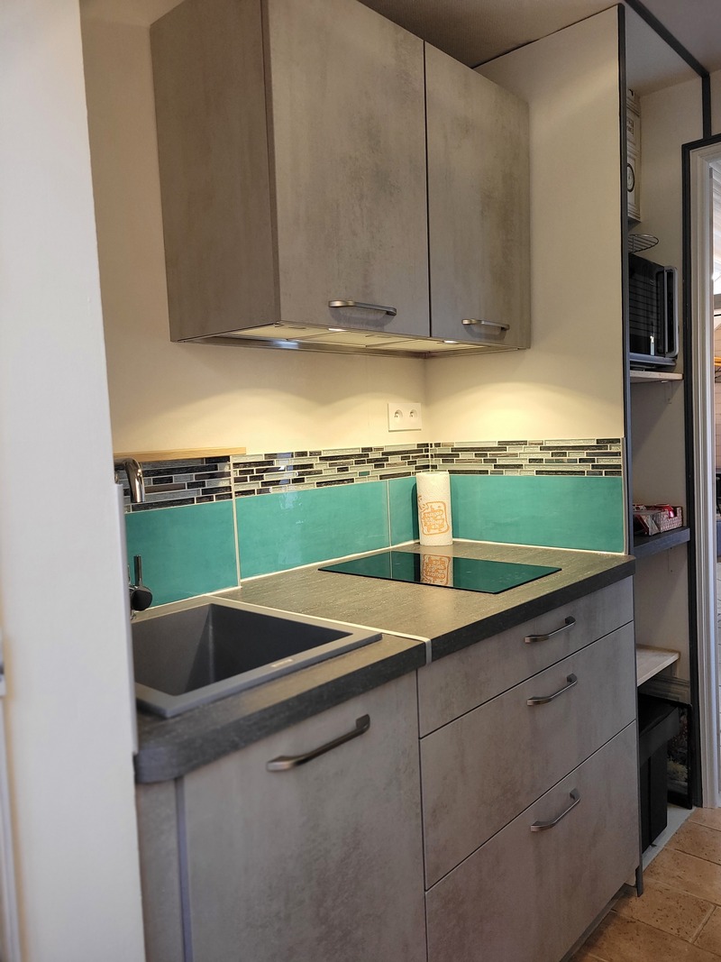 Studio au rez de jardin avec terrasse privée, espace nuit, salle de bains, cuisine et salon / salle à manger