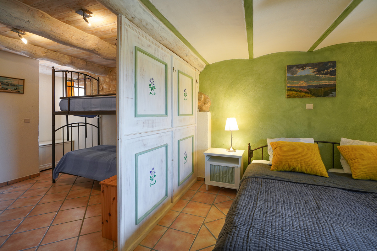 Chambre avec un lit Kingsize et un lit superposé avec séparation murale.