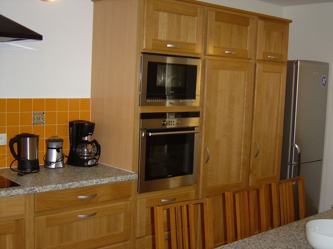 Lave linge, lave vaisselle, micro-onde, réfrigérateur, cafetière, bouilloire, vaisselle et couverts, sèche-linge, grille-pain, plaque de cuisson, ustensiles de cuisine