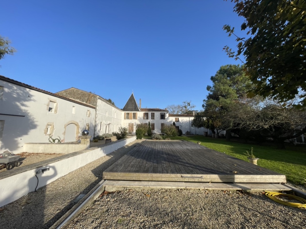La Cour centrale avec sa Piscine solaire est sécurisée avec deux terrasses bois coulissante (10x5m) à l'ombre d'un Platane inventorié "arbre remarquable."