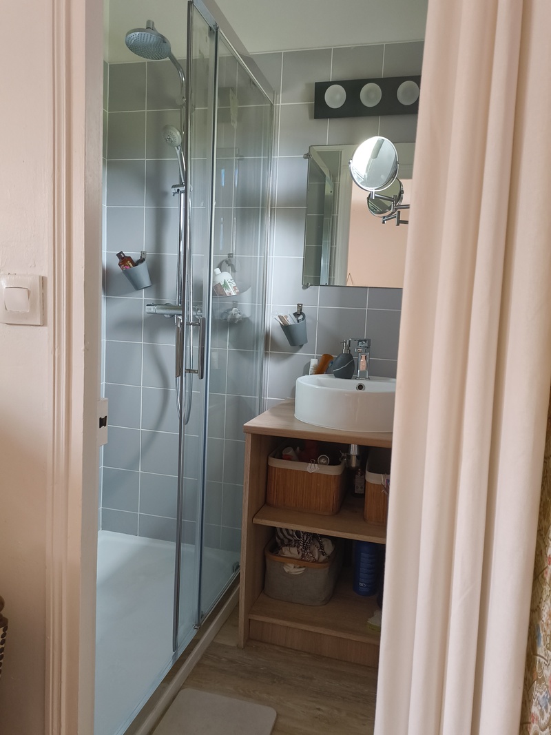 Lit double de 140, salle de douche privative, portant et commode pour vêtements