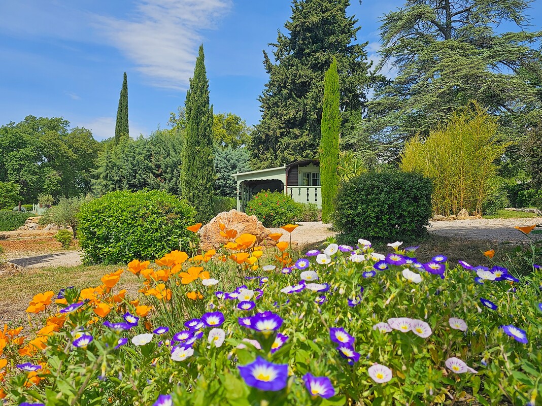 Lodge de 28 m2 tout en bois, posé sous un cèdre du Liban bicentenaire. Vue reposante sur les collines et les vignes, avec en arrière-plan le massif de la Sainte-Baume.