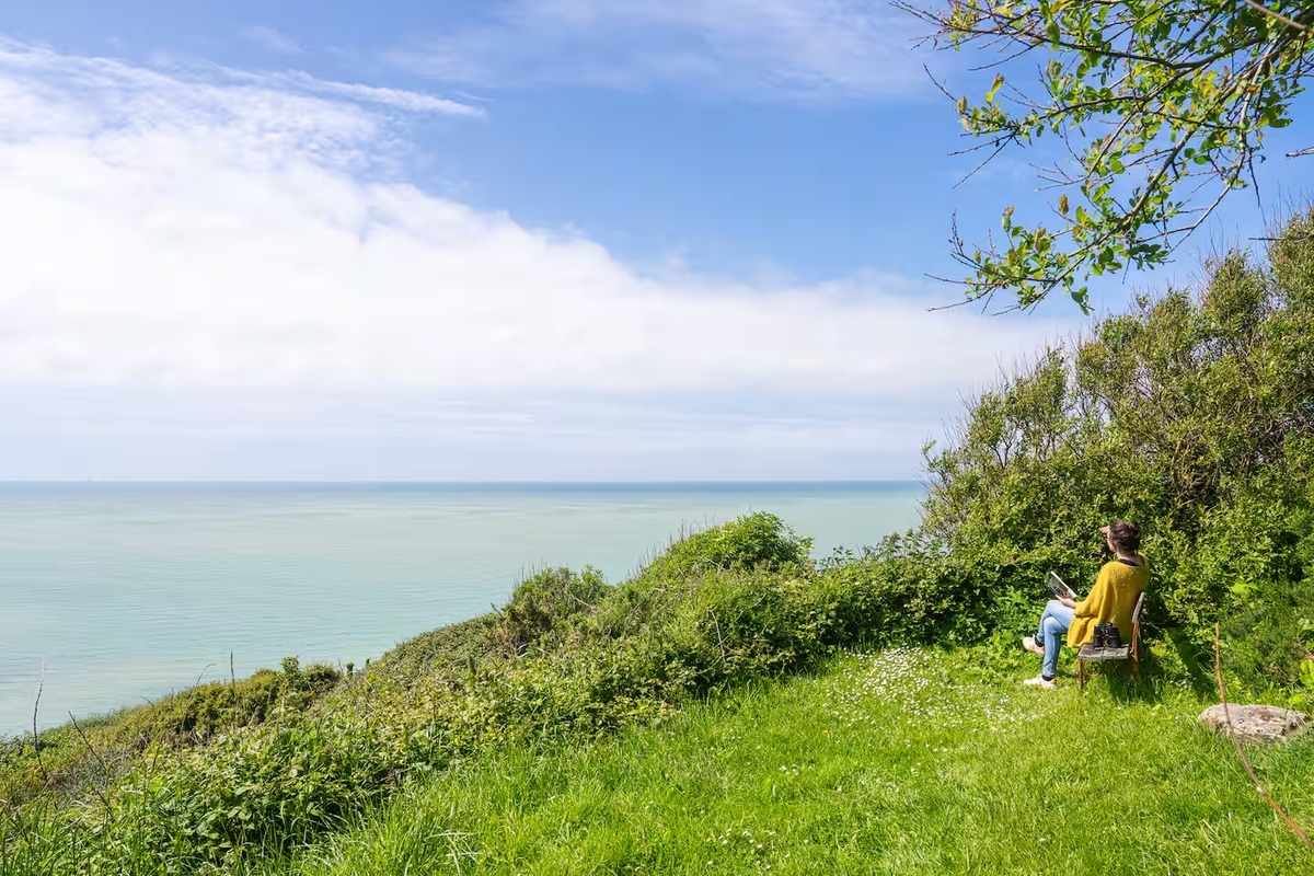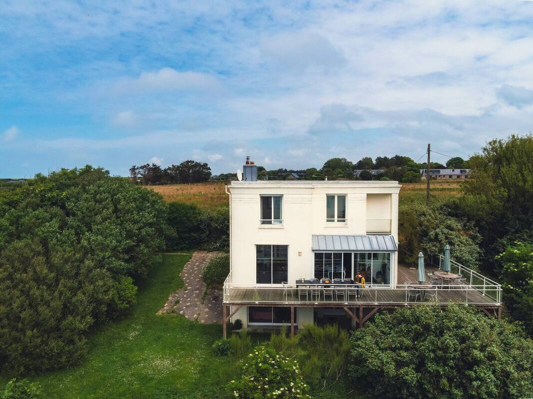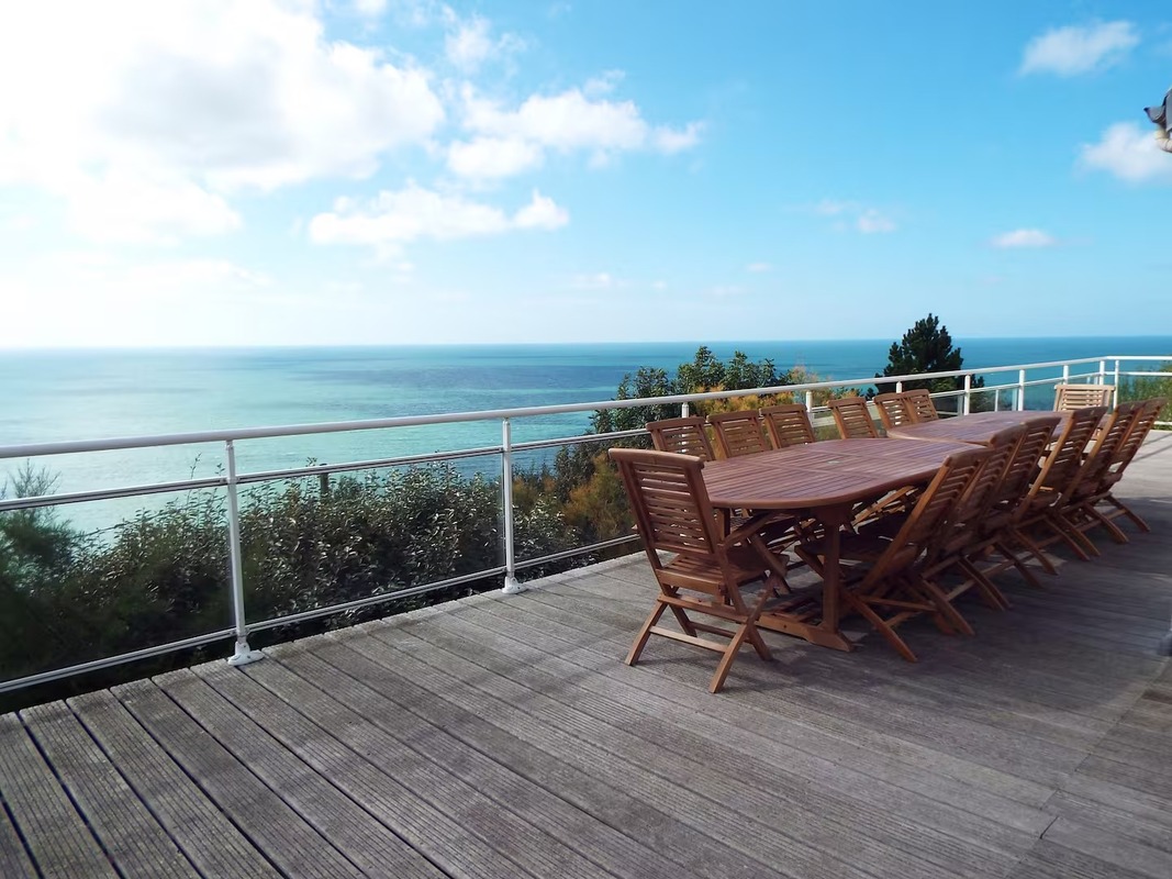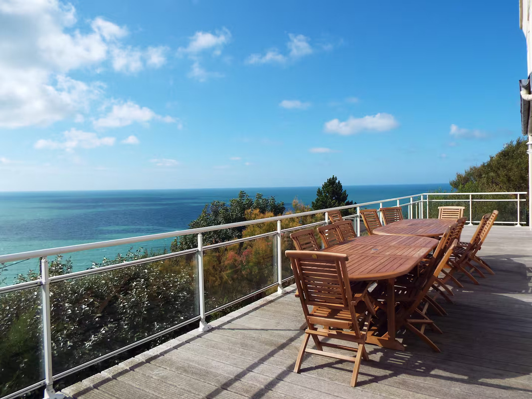 Profitez de la vaste terrasse exposée au sud et à l'ouest, offrant une vue imprenable sur la mer, les falaises et la campagne environnante et du jardin entièrement clos de 3 500 m², abritant des espaces paisibles où vous pourrez vous détendre et méditer face à la mer.