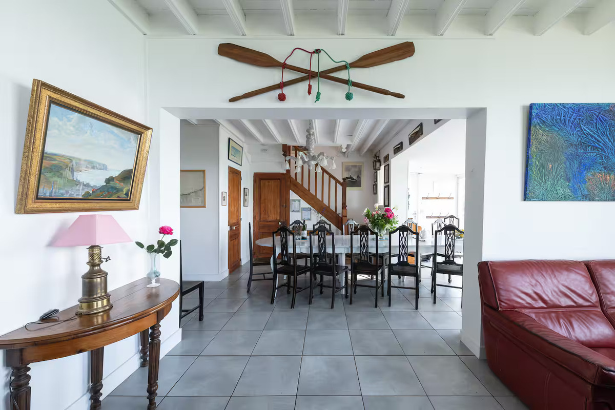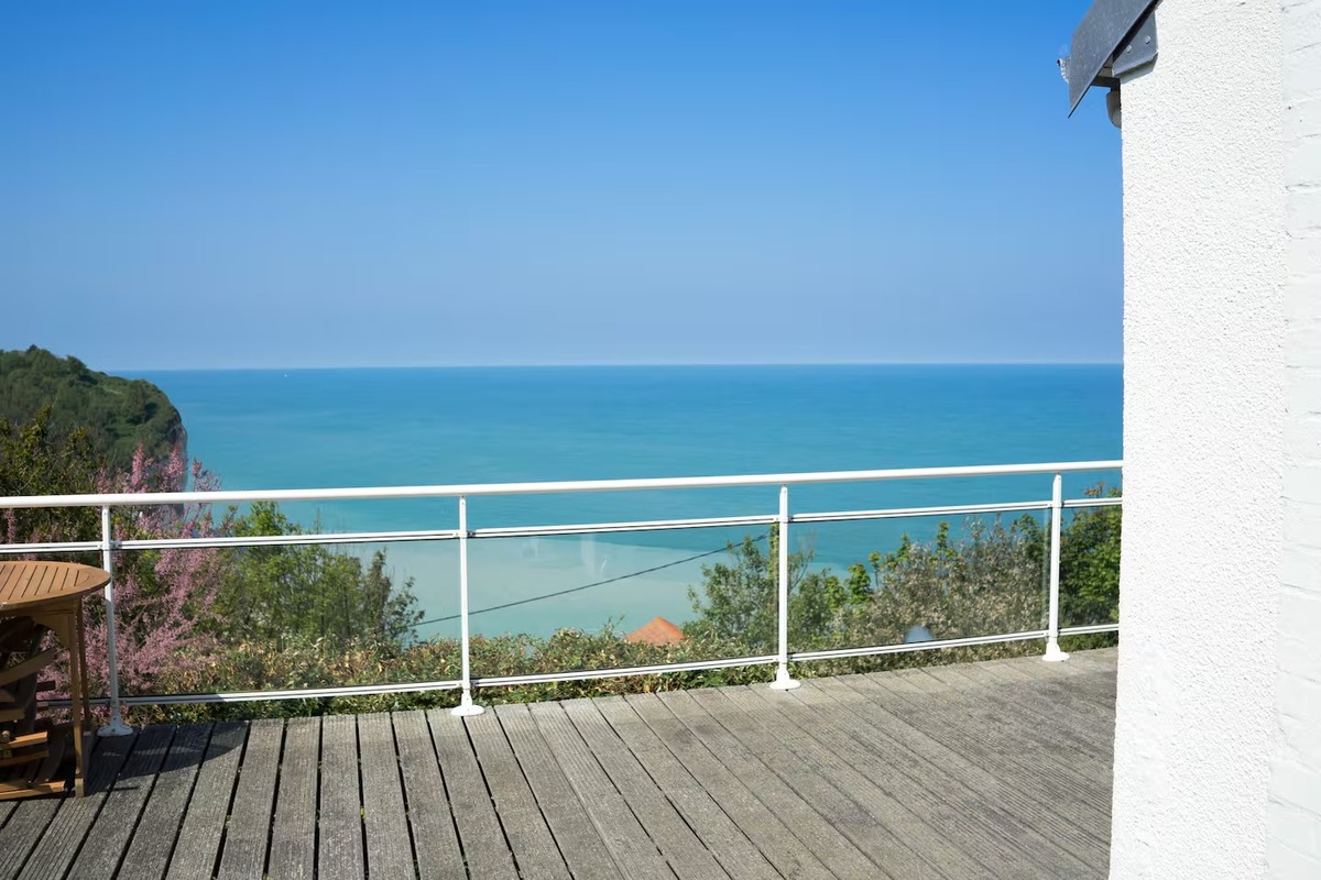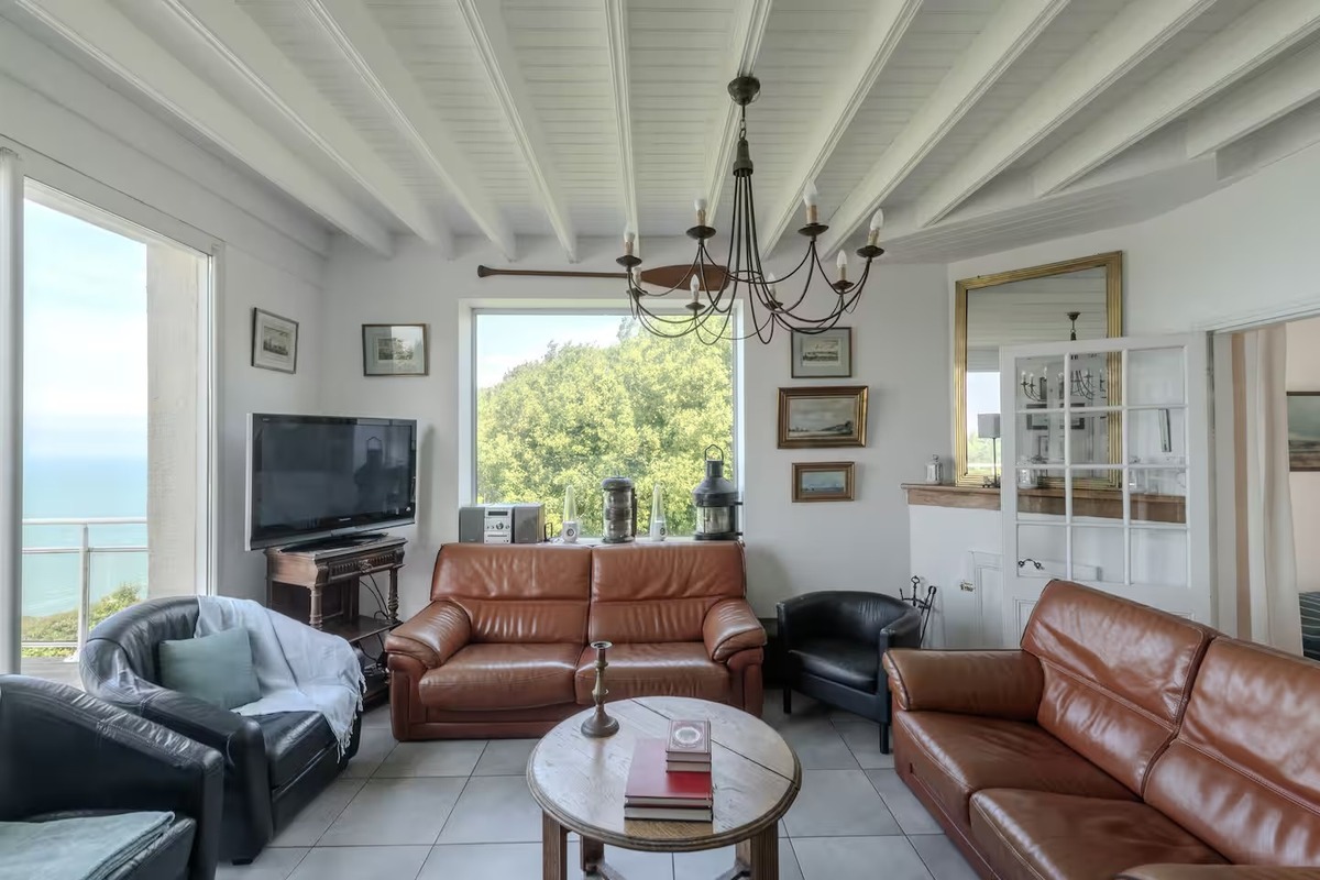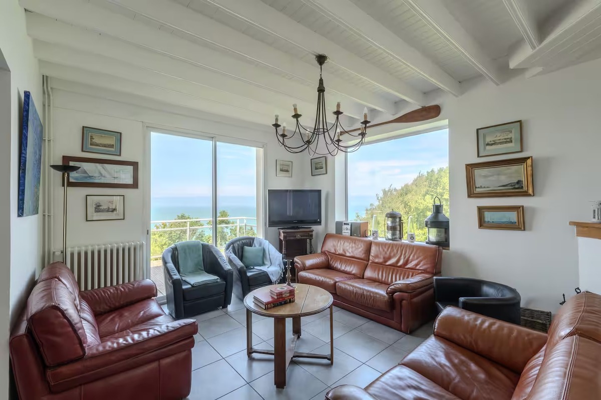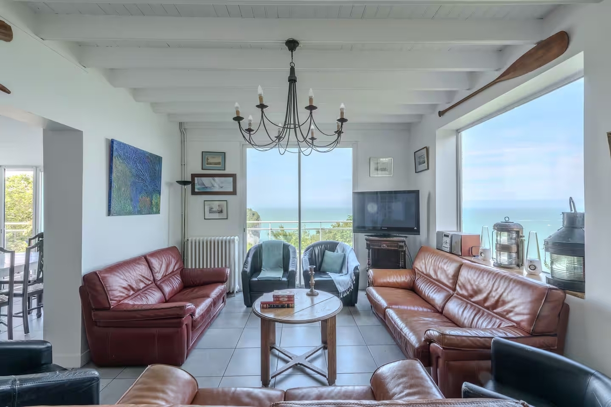 . VOUS DÉTENDRE : Détendez-vous dans notre salon confortable, offrant une vue imprenable sur la mer, la plage et les falaises, tandis que la cheminée crépite, ajoutant une touche de chaleur à vos soirées.