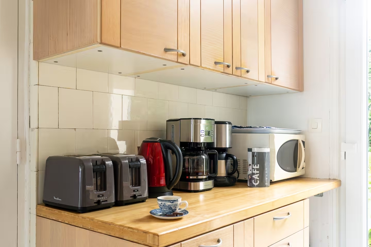 Lave linge, lave vaisselle, congélateur, micro-onde, four, réfrigérateur, cafetière, bouilloire, vaisselle et couverts, sèche-linge, grille-pain, plaque de cuisson, ustensiles de cuisine, tables à repasser, fer à repasser