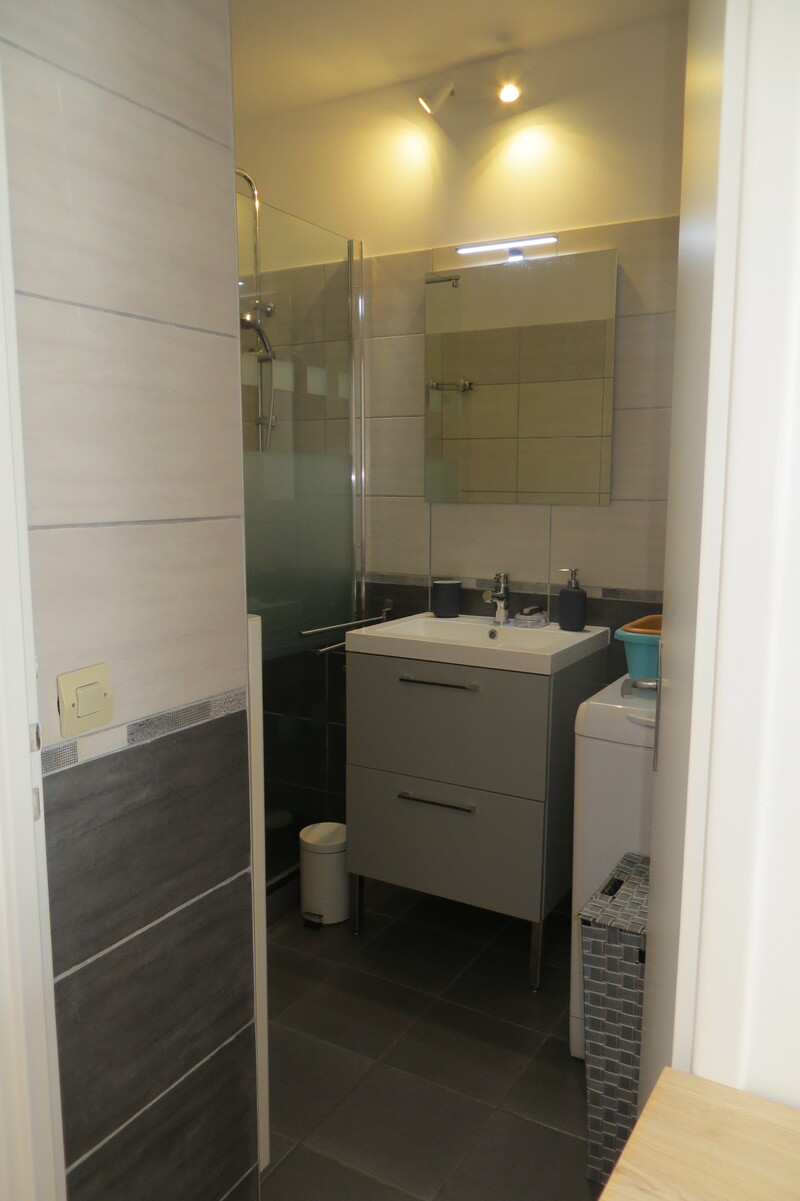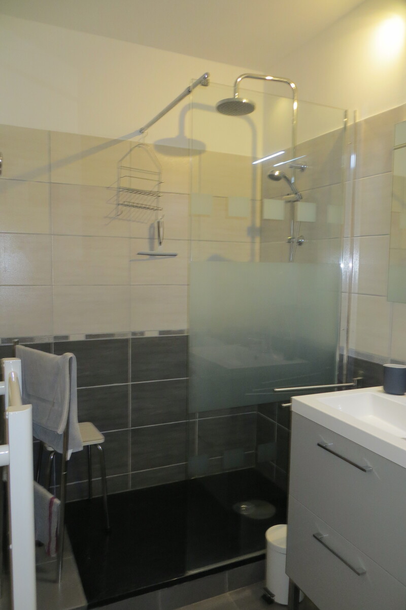 Salle d'eau rénovée avec douche italienne, lavabo et lave-linge