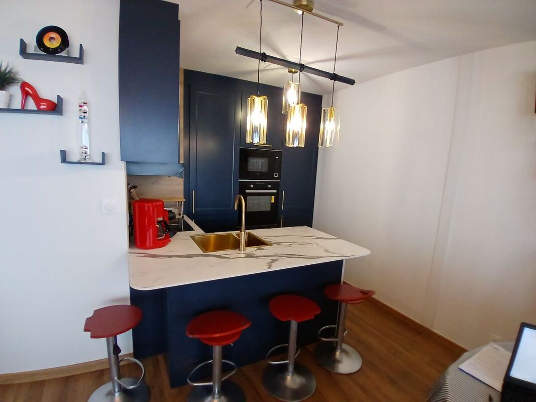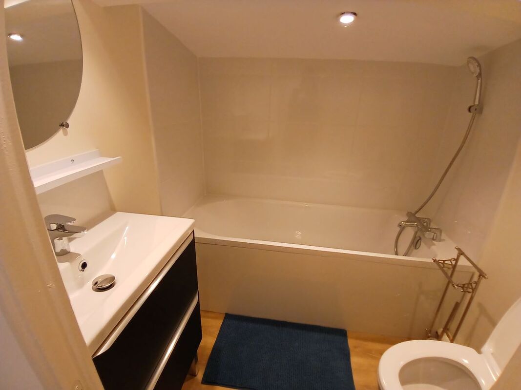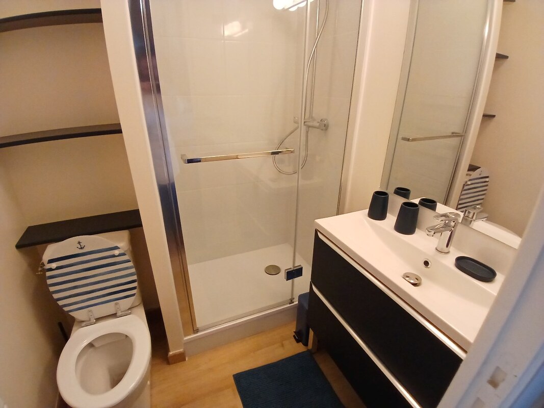 La location se compose d’une belle pièce à vivre avec cuisine ouverte toute équipée, d’un séjour et d’un salon avec grand canapé d’angle confortable et TV. À l’entrée, salle d’eau avec douche, vasque , sèche serviette et sèche cheveux, et WC.