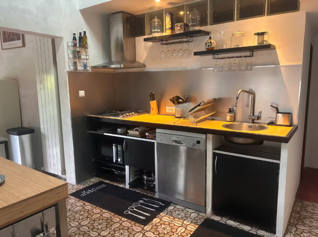 Lave linge, lave vaisselle, congélateur, micro-onde, four, réfrigérateur, cafetière, vaisselle et couverts, grille-pain, plaque de cuisson, ustensiles de cuisine