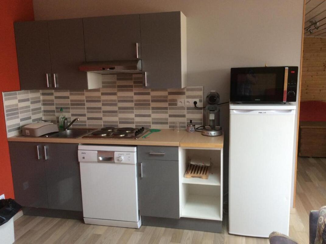 Congélateur, micro-onde, four, cafetière, vaisselle et couverts, plaque de cuisson