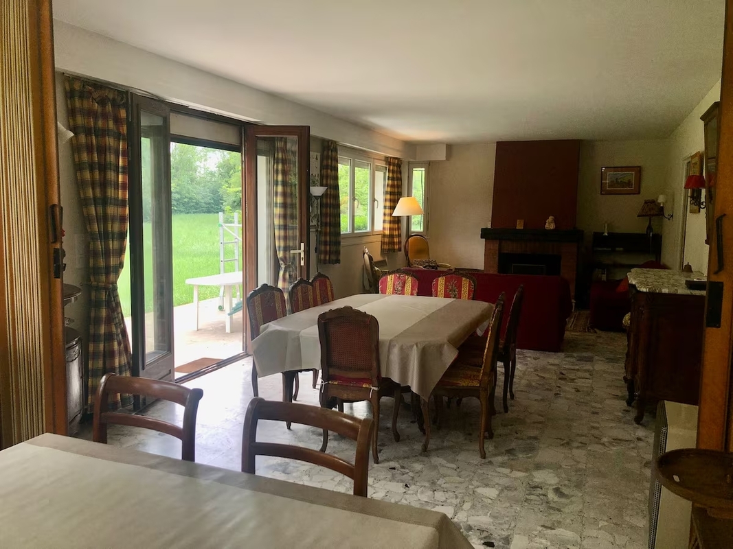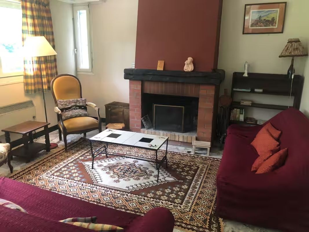Grande salle de séjour pour jouer, prendre les repas, avec cheminée.