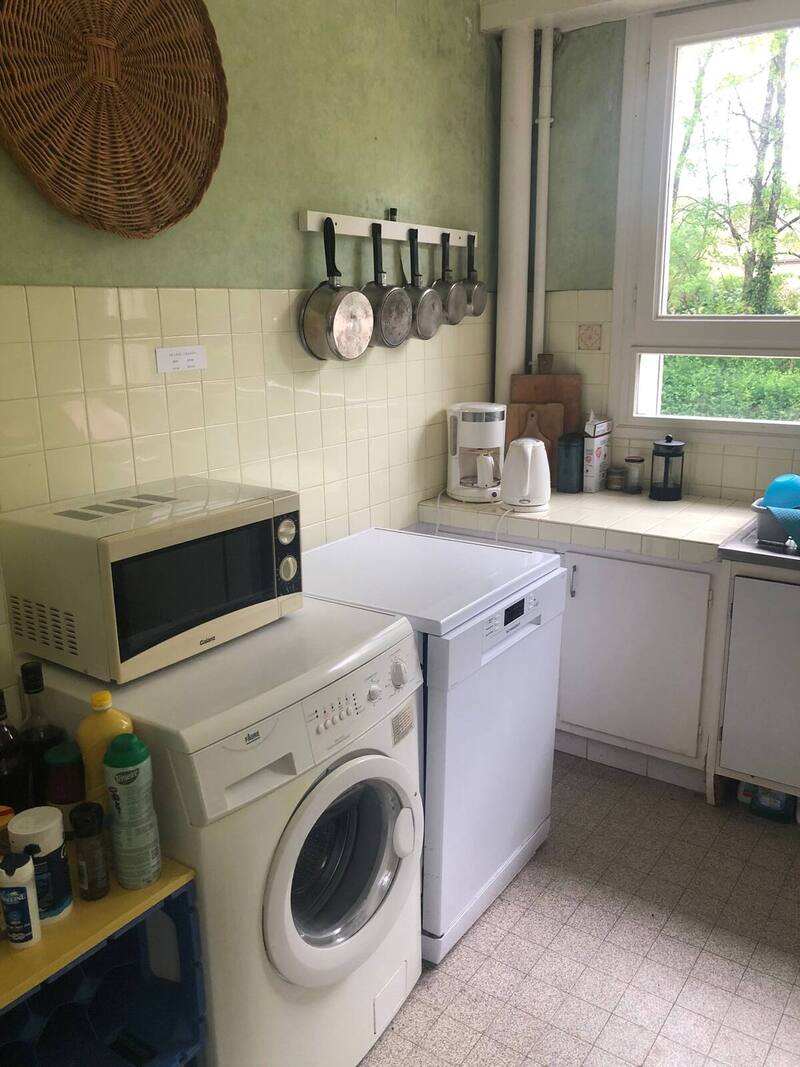 Lave linge, lave vaisselle, congélateur, micro-onde, four, réfrigérateur, cafetière, bouilloire, vaisselle et couverts, sèche-linge, grille-pain, plaque de cuisson, ustensiles de cuisine