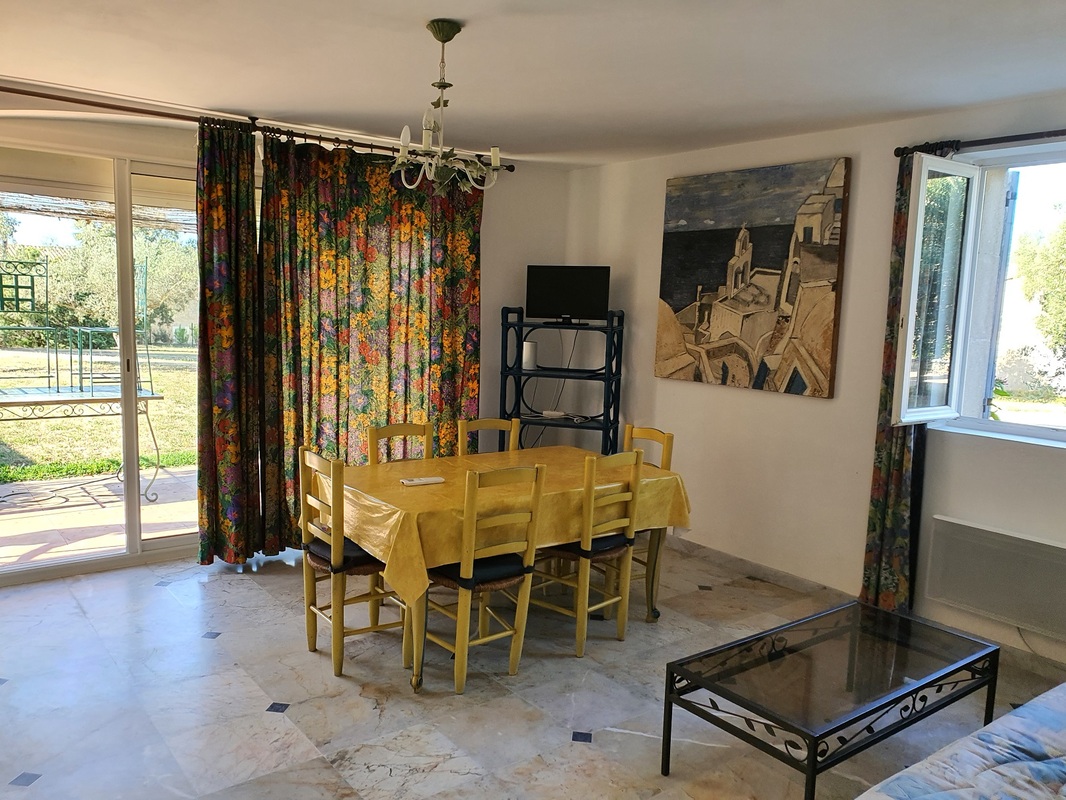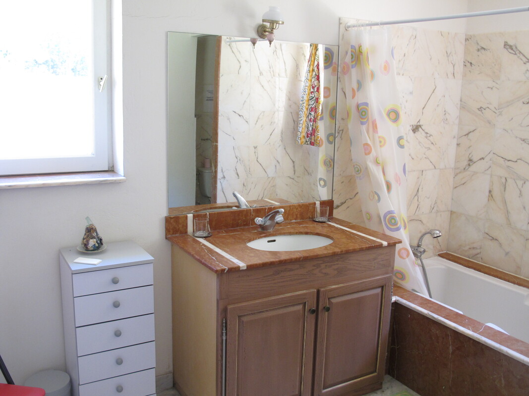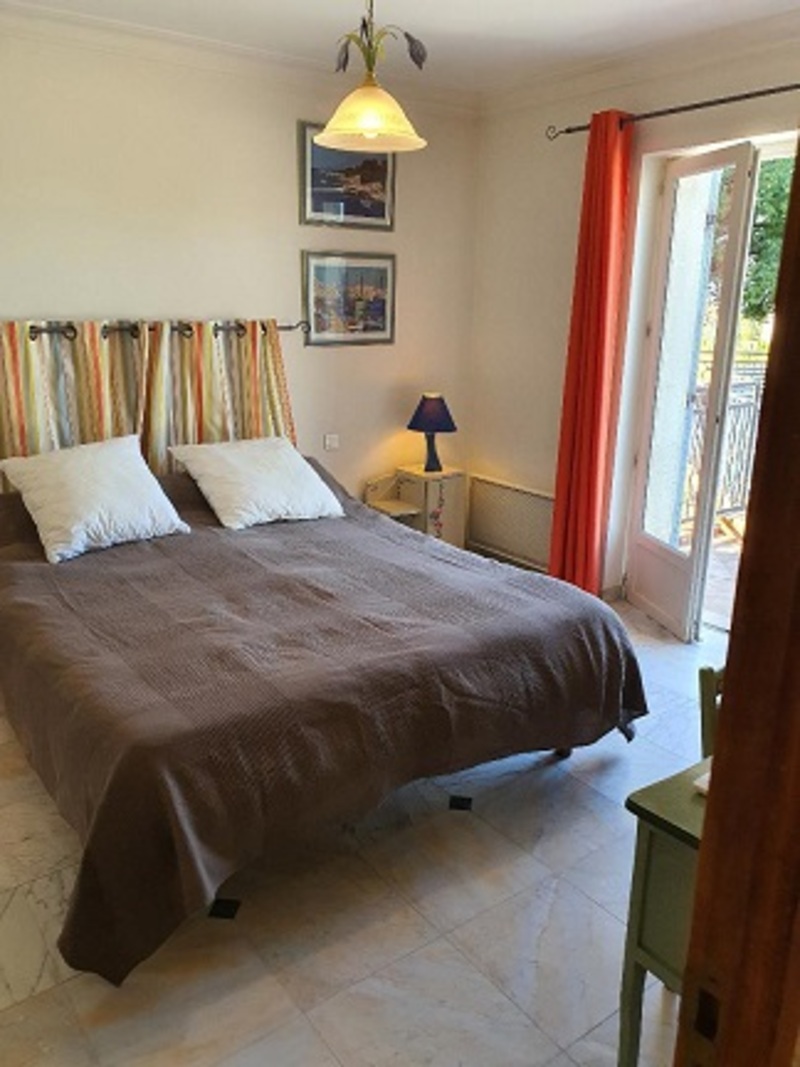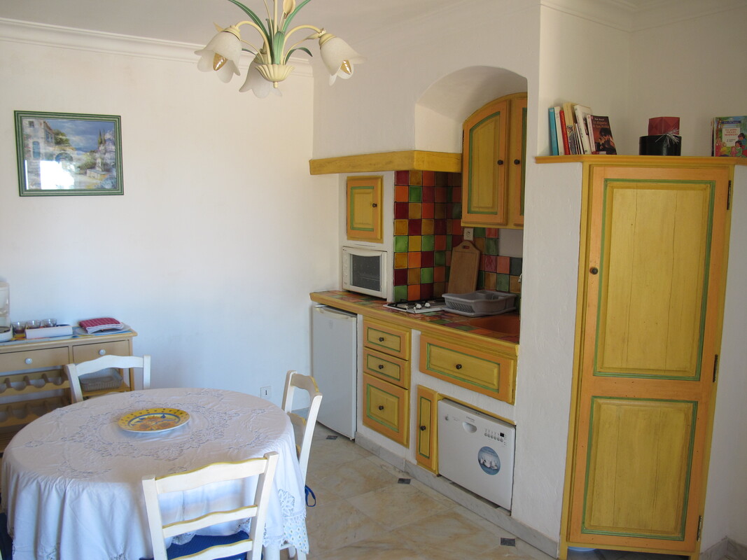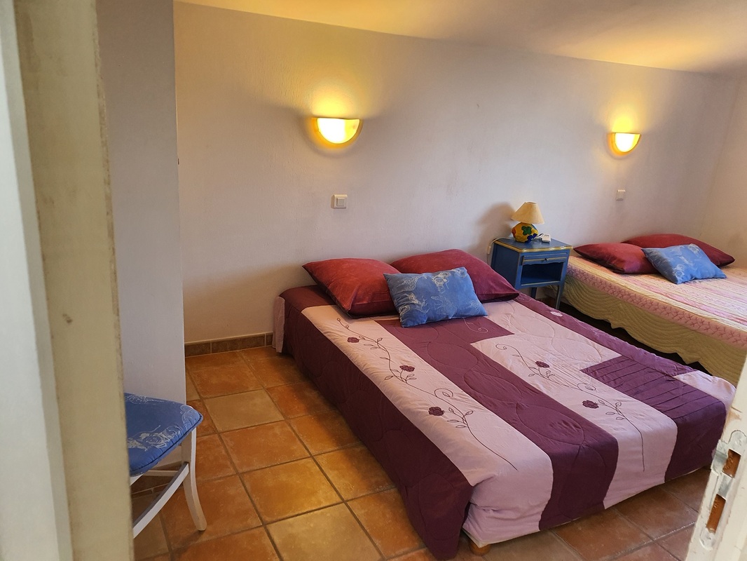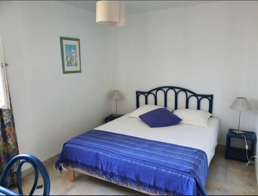 Ce logement est pour vous si vous êtes une famille composée d’un couple et deux enfants ; la chambre bleue est réservée aux parents ; la chambre cabine, avec deux lits superposés, est réservée aux enfants. La salle d’eau, rose et verte, est équipée d'un grand bac à douche. Le séjour, très vaste, composé d’une cuisine américaine aux tons pastels, d’un salon avec Clik-clak pour deux personnes et d’une salle à manger, donne directement sur une grande terrasse couverte et une pelouse plantée d’oliviers.
