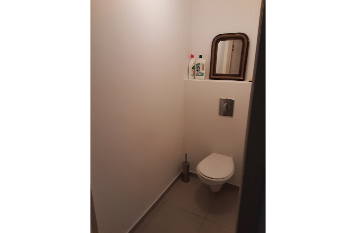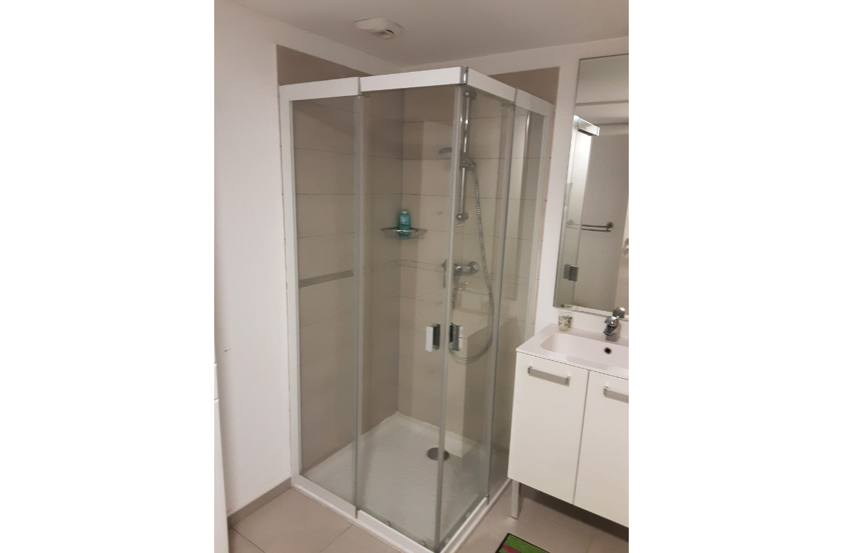 Chambre équipée d'un lit double, salle d'eau et toilettes.