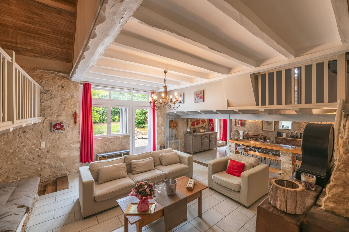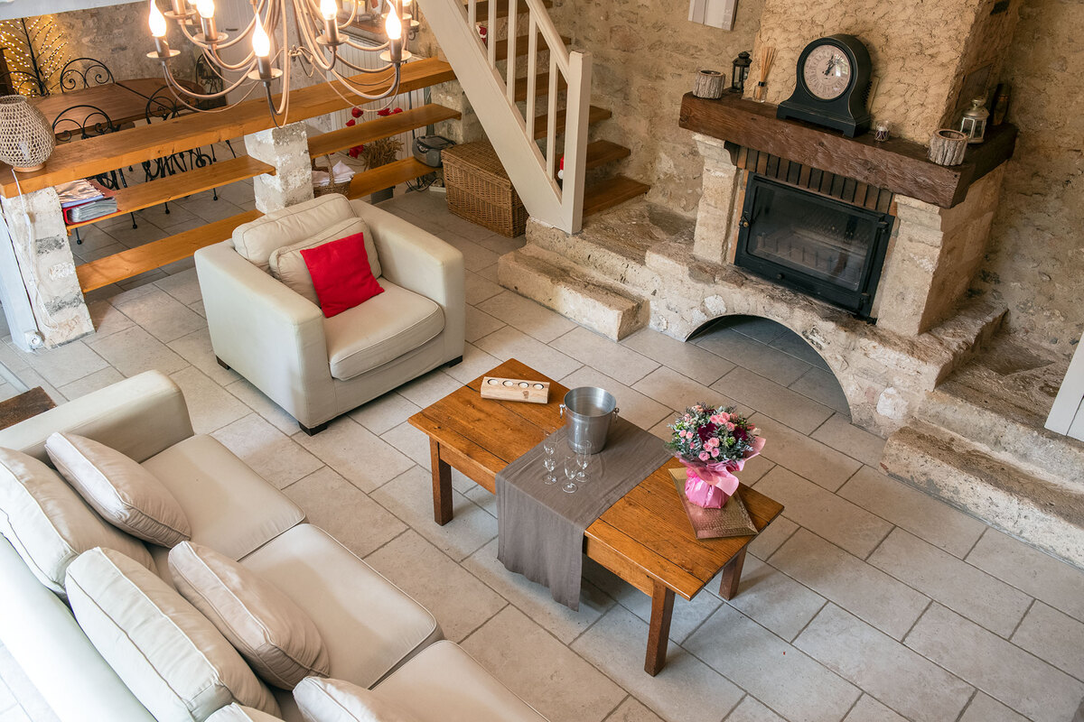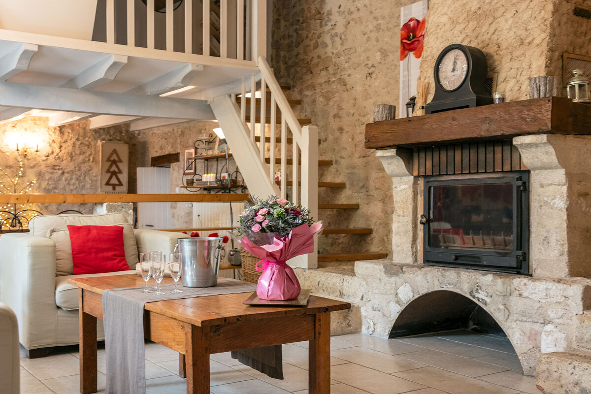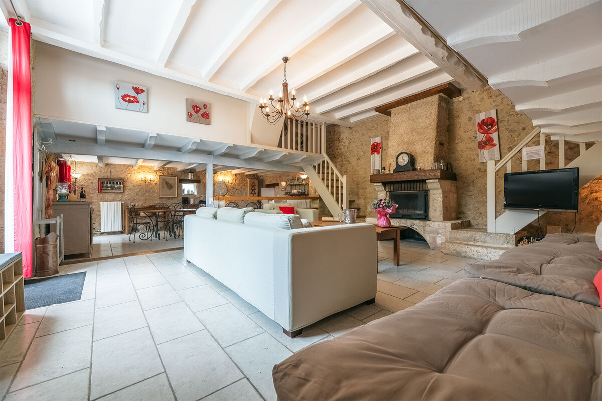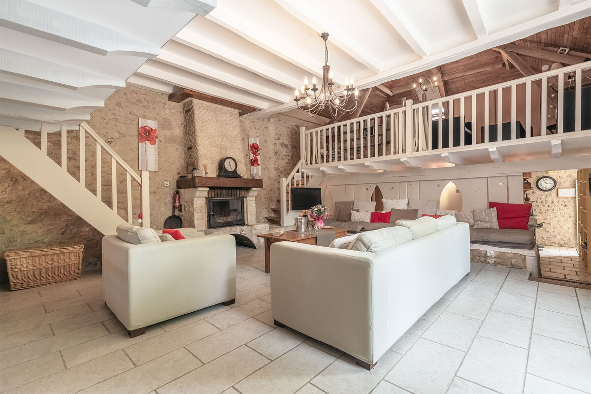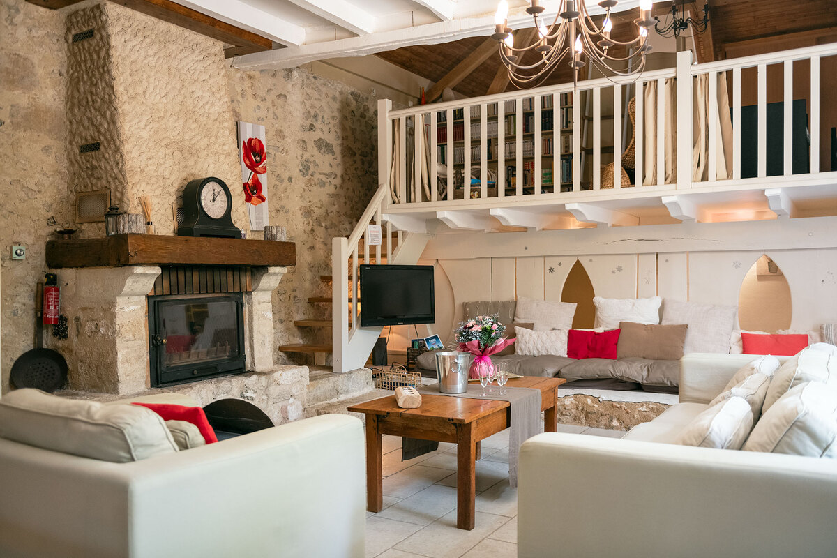 - Séjour Cathédrale (60 m²) : Cheminée en pierre, poutres apparentes, murs en pierres... un lieu de vie chaleureux et convivial.