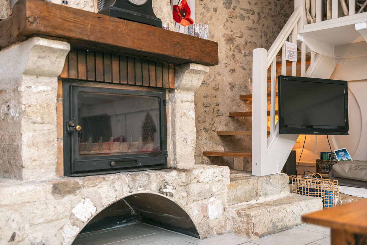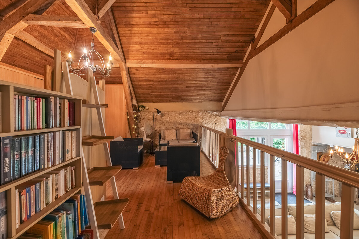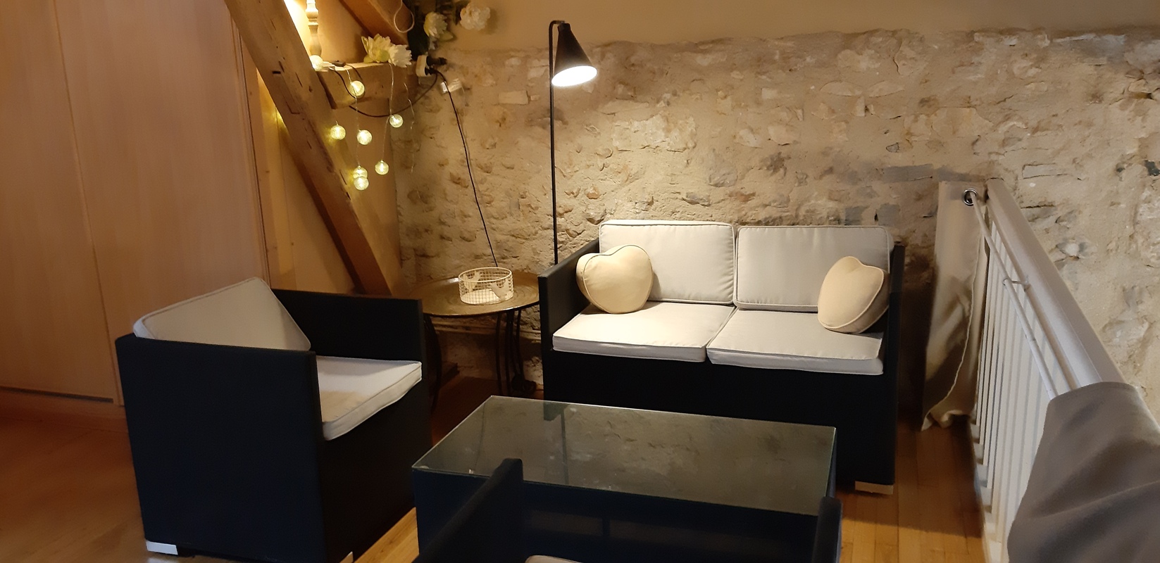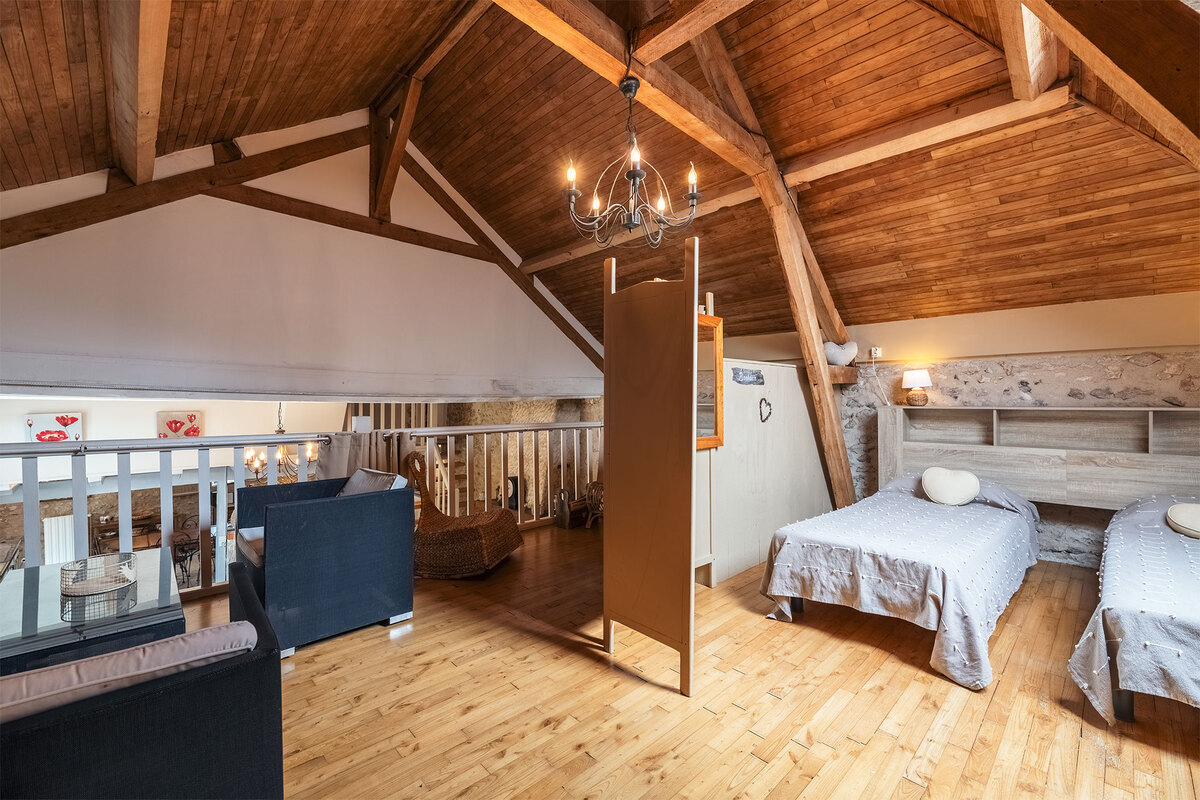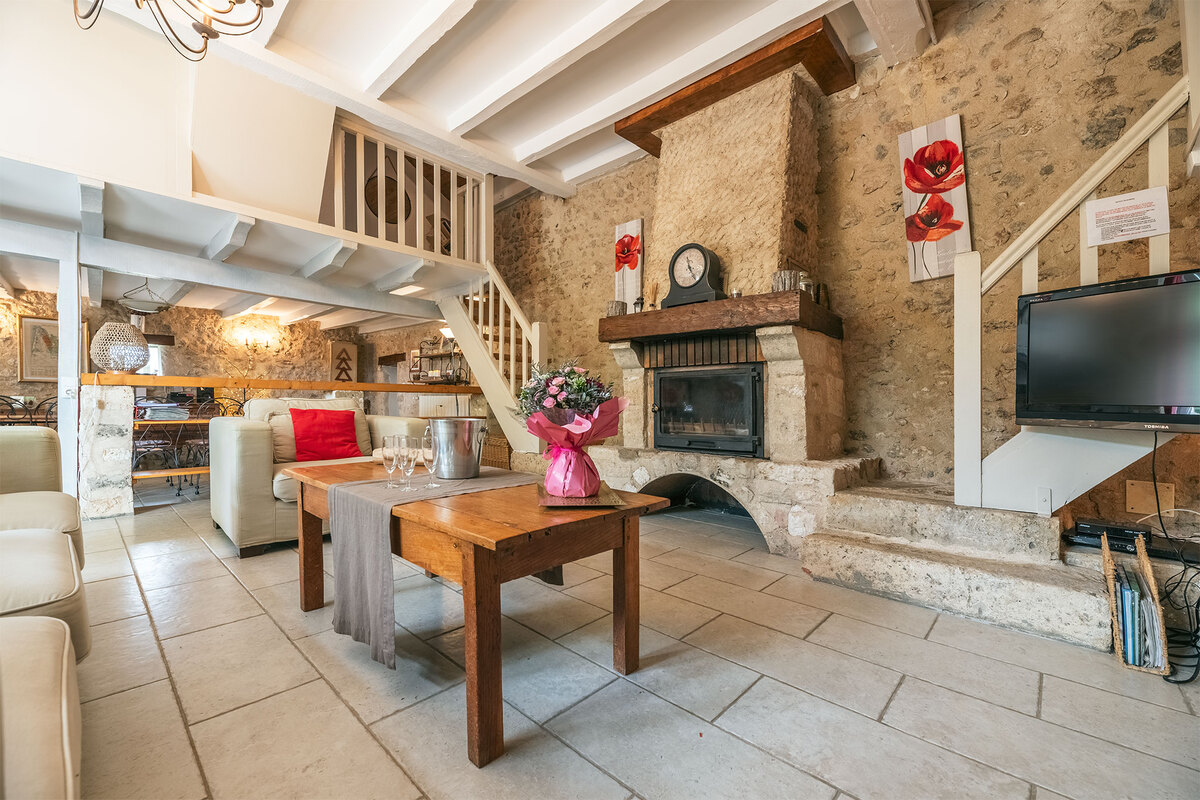 - Séjour Cathédrale (60 m²) : Cheminée en pierre, poutres apparentes, murs en pierres... un lieu de vie chaleureux et convivial.