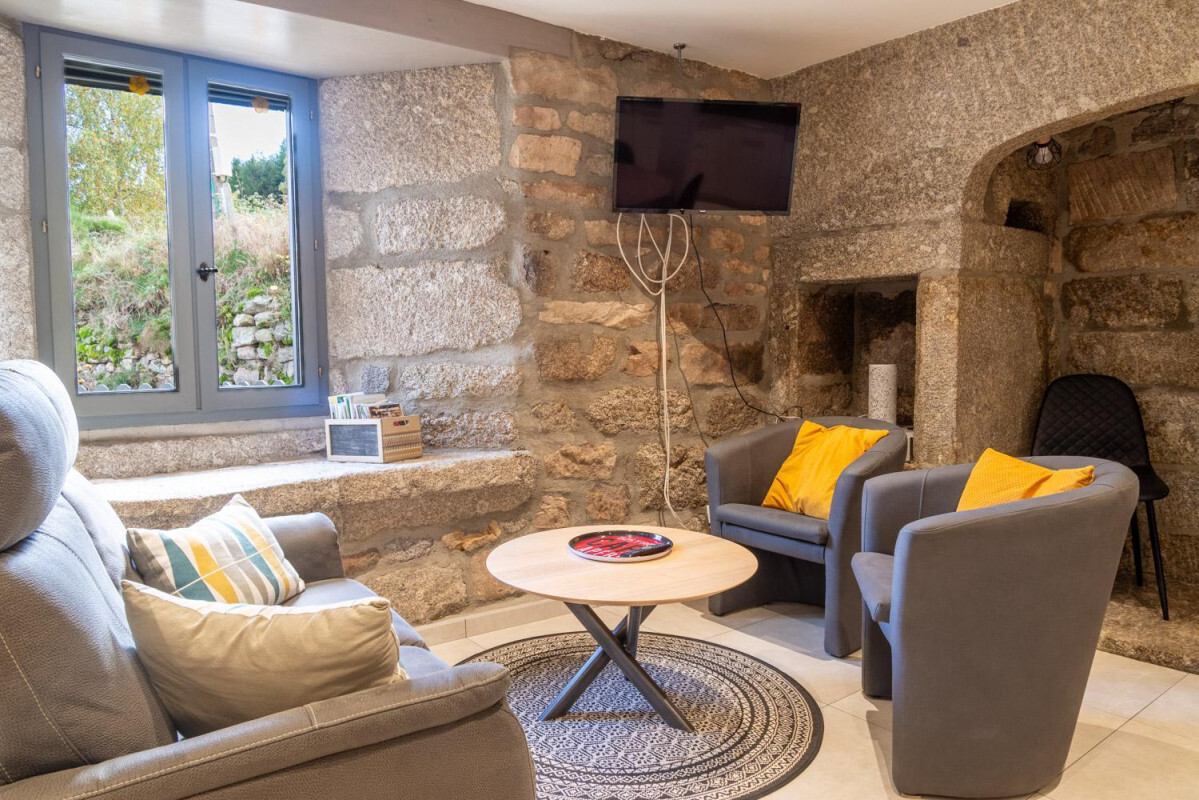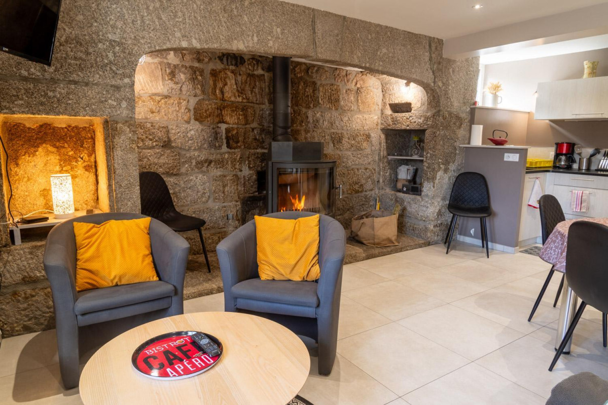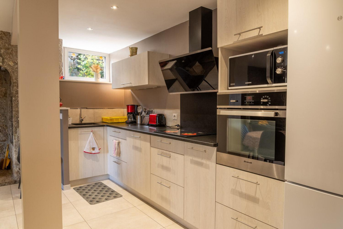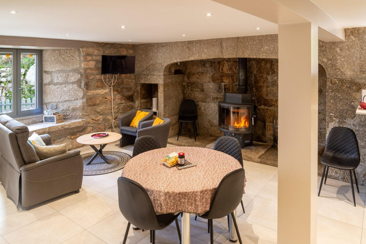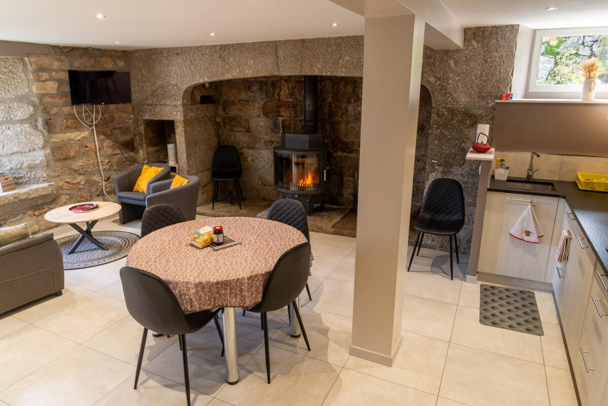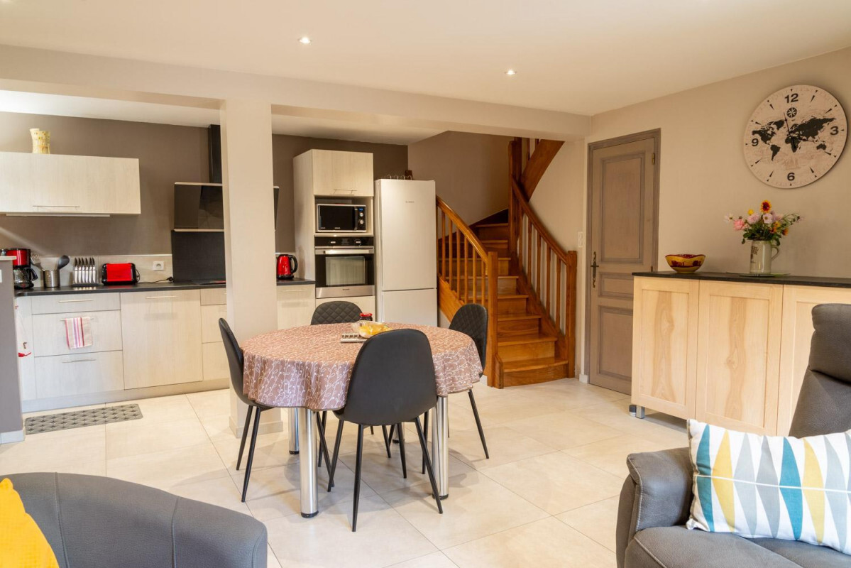 Au rez-de-chaussée, un espace convivial avec une cuisine moderne ouverte, entièrement équipée (réfrigérateur-congélateur, lave-vaisselle, four électrique, micro-ondes, plaques à induction, etc.), donnant sur une salle à manger lumineuse et un salon chaleureux avec poêle à bois et télévision. Vous y trouverez également des toilettes séparées ainsi qu’une buanderie-cellier pratique avec lave-linge (7 kg).