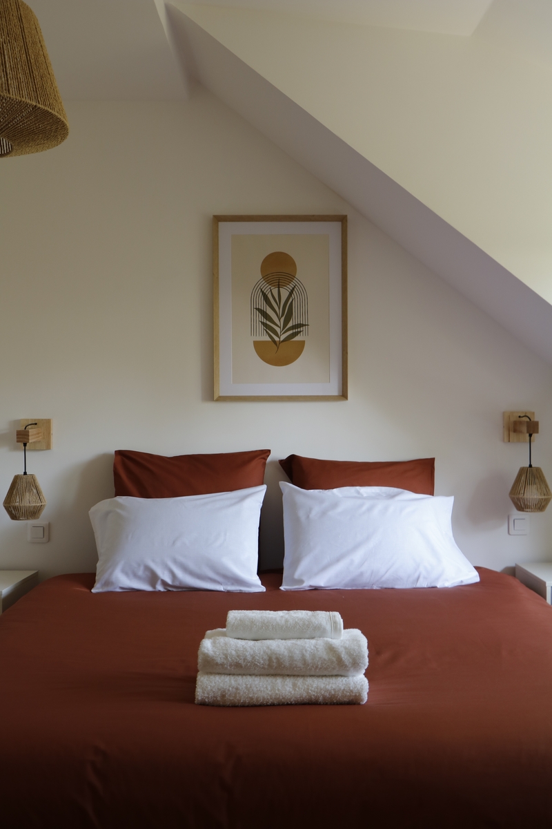 Chambres élégante (1 lits King Size modulable avec literie haut de gamme et espace de travail (Wifi / Fibre / ethernet) .